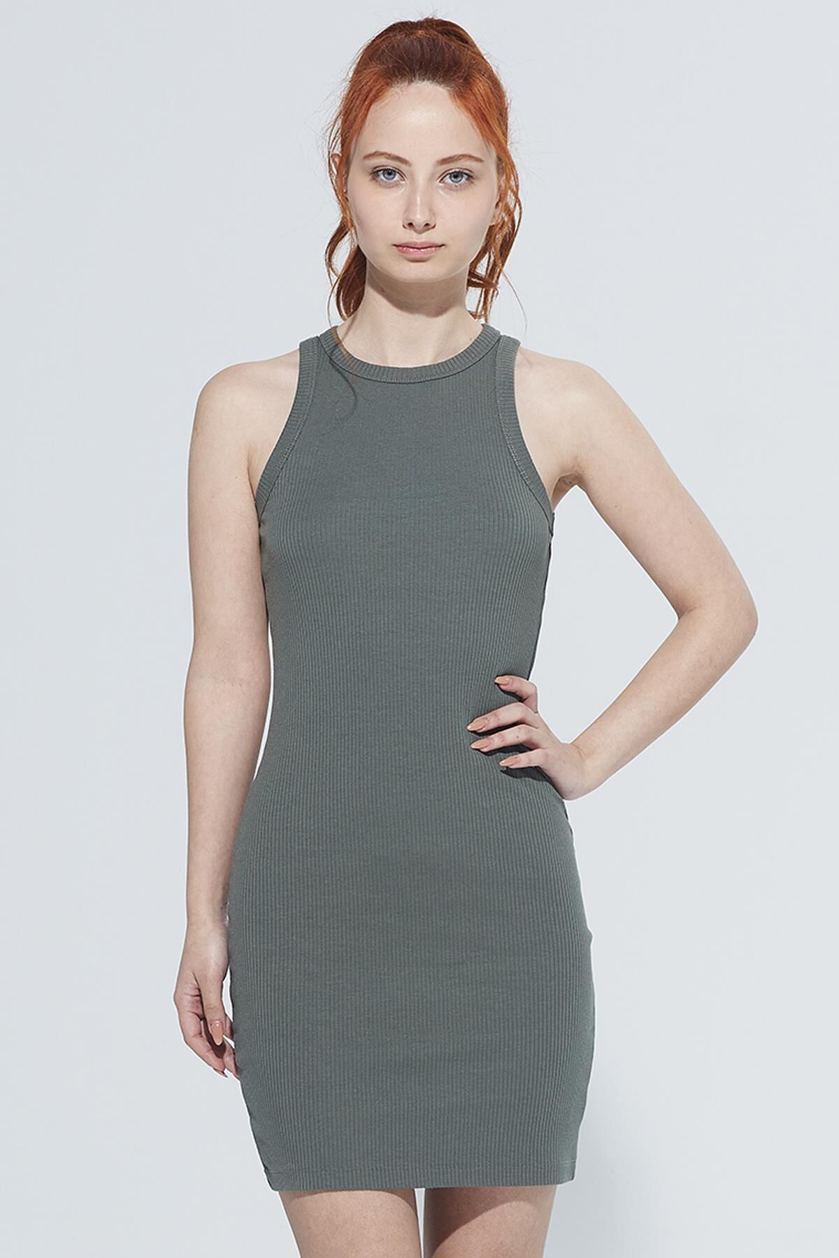 Comm-Ci Dakota Halter Yaka Ribanalı Diz Üstü Basic Örme Elbise - moss