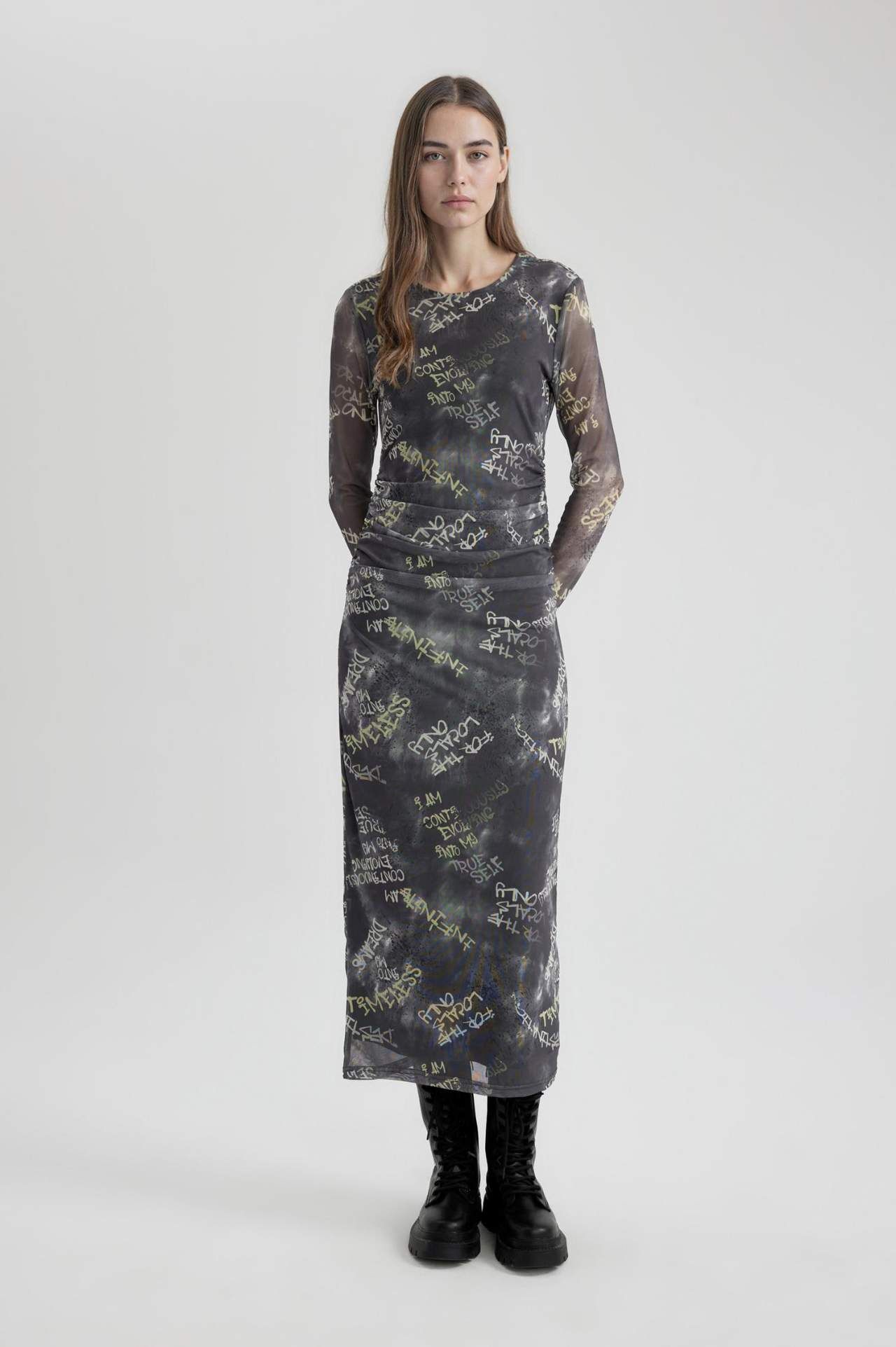 DeFactoFit Coool Bodycon Desenli Maxi Uzun Kollu Elbise