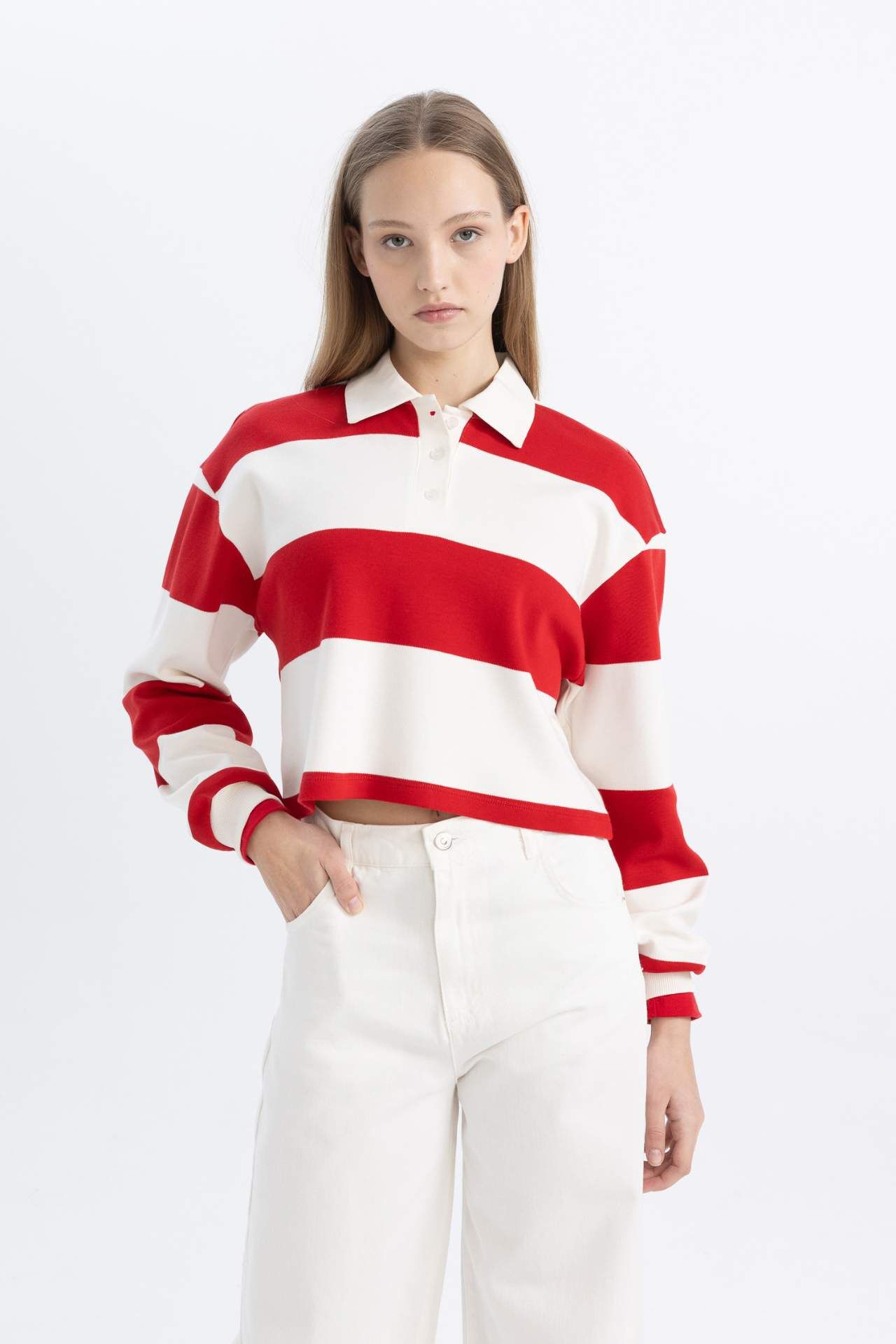 Şık ve modern bir görünüm sunan Crop Çizgili Uzun Kollu Polo Tişört, gardırobunuzun vazgeçilmezi olmaya aday. Yüksek kaliteli kumaşı ve şık çizgili tasarımıyla hem şıklığı hem de konforu bir arada sunuyor. Bu sezonun trendlerine uyum sağlayan bir parça arıyorsanız, bu tişört tam size göre! Pamuk 100%,Pamuk 100%
