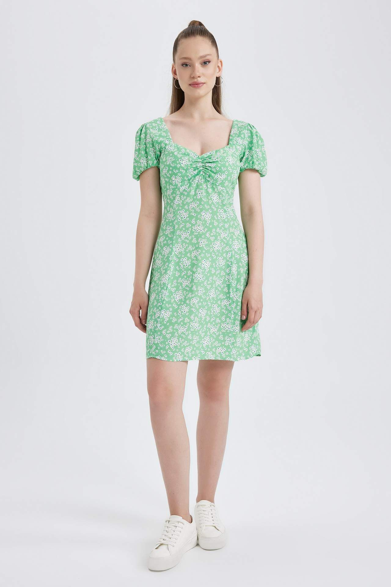 Çiçek desenli, yuvarlak yaka trend bir görünümü olan, şık ve rahat giyinmeyi seven kadınlar için tasarlanmış, günlük kombinlerinizde her ortamda tercih ederek stil sahibi görünebileceğiniz, rahat viskon yapısıyla DeFacto Kadın Coool Kalp Yaka Floral Maroken Balon Kollu Mini Kısa Kollu Elbise. Viskoz 100%,Viskoz 100% Manken Bedeni: Göğüs: 78 Boy: 1,73 Basen: 87 Bel: 57