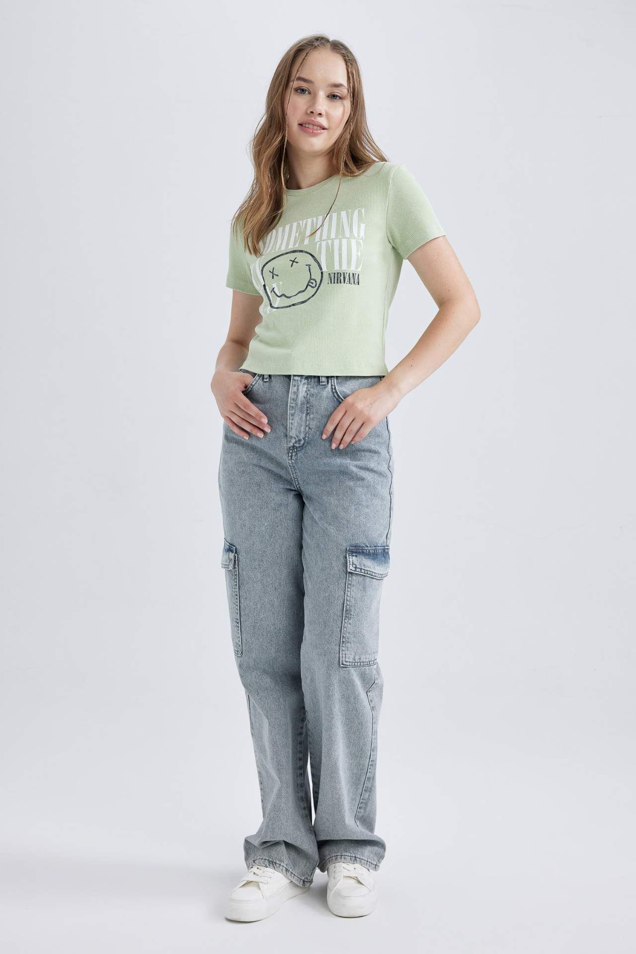 Trend tasarımı ve pamuk karışımlı kumaşı ile her mevsim gardırobunuzda bulunması gereken kullanışlı bisiklet yaka, Nirvana Lisans baskılı modeliyle, jogger eşofman altı, jogger pantolon, jean pantolon, jean şort, mom jean, boyfriend jean, yüksek belli pantolon, blazer ceket, şort etek ve eteklerinizle kombinleyebileceğiniz DeFacto Kadın Coool Nirvana Fitted Baskılı Kısa Kollu Tişört. Pamuk 97%,Elastan 3%,Pamuk 97%,Elastan 3% Manken Bedeni: Göğüs: 85 Boy: 1,74 Basen: 90 Bel: 62
