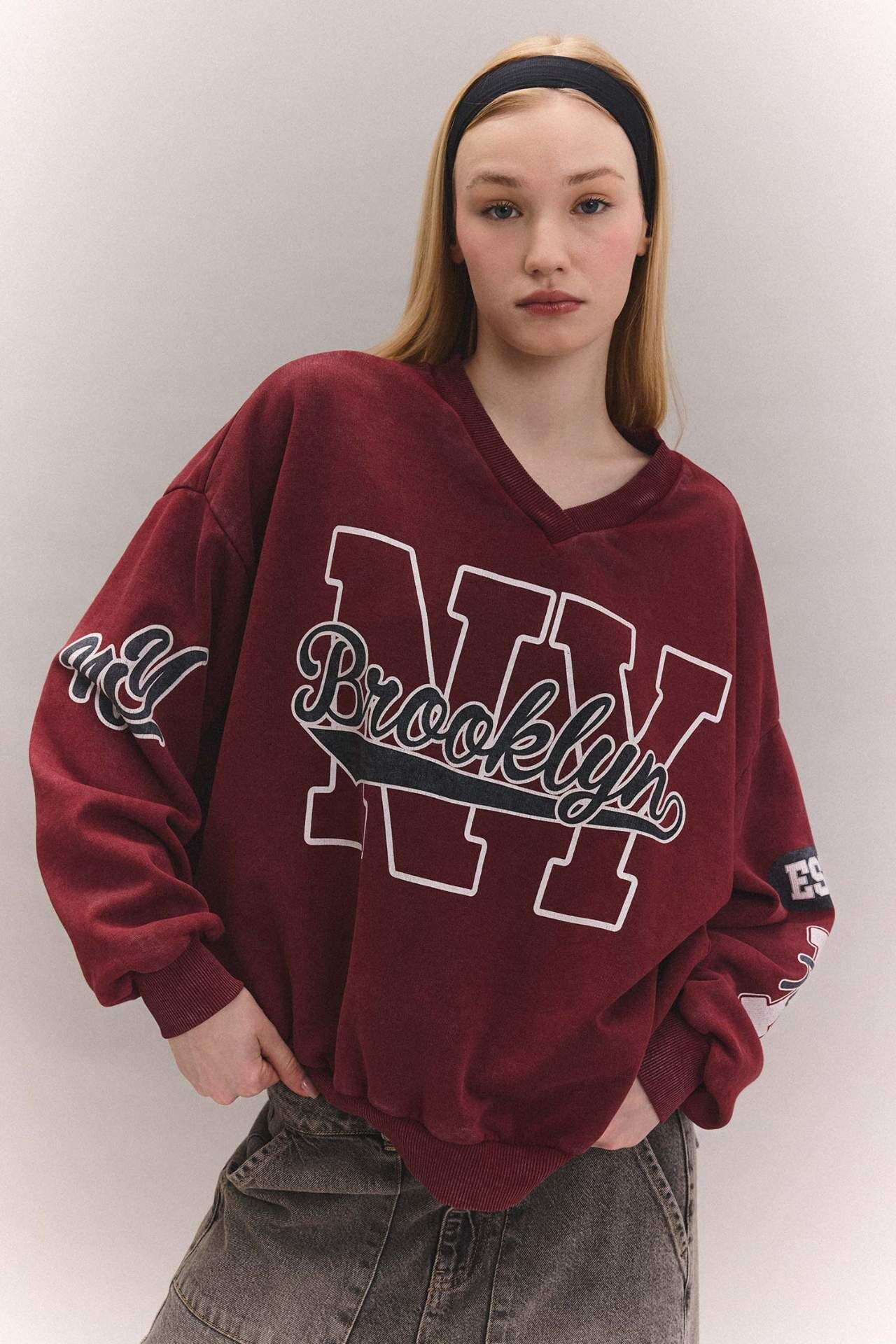DeFactoFit Coool Oversize Fit V Yaka Baskılı Sweatshirt