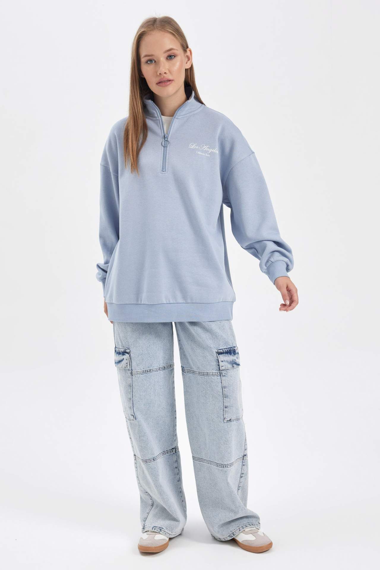 Yarım fermuarlı, dik yaka,oversize fit trend tasarımı ve bol kesimli rahat kalıbı ile mutlaka dolabınızda olması gereken, her renk pantolon, etek, jogger eşofman altı jogger pantolon, chino pantolon ve taytlarla kolayca kombinlenebilen, pamuklu kumaşı ile DeFacto Kadın Coool Oversize Fit Yarım Fermuarlı Sweatshirt. Pamuk 58%,Viskoz 8%,Poliester 34%,Pamuk 58%,Viskoz 8%,Poliester 34%