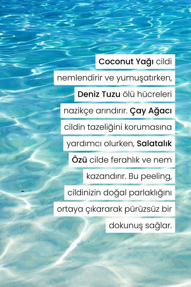 Scrub Peeling 250 Ml Kullanım Şekli; Öncelikle Cildinizi temizleyip, çok sıcak olmayan su ile yumuşatınız.; Daha sonra , deniz tuzu ile karışık scrub yağınızı nazikçe masaj yaparak cildinize yayınız.; Küçük ovalama hareketleri ile ölü derilerinizi iyice soyabilirsiniz.; Scrub rutininden sonra ılık bir duş ile cildinizi rahatlatabilirsiniz.; Deniz tuzu Vücudu derinlemesine arındırır.; Enerjinizi dengeler.; Hindistan Cevizi Yağı Cildinizin yağ dengesini korurken, yumuşatır ve besler.; Salatalık Özü Salatalık bitkis idoğal olarak özünde C vitamini ve Kafeik asit içerir.; Çok güçlü bir antioksidandır.; Yeşil Çay Özü Doğal bir antioksidandır, içerisinde şifalı biyoaktifler catechins, L-theanine, andcaffeine barındırır.; Cilt yenilenmesini destekler.; SODIUM CHLORIDE,HELIANTHUS ANNUUS SEED OIL, PARFUM, COCOS NUCIFERA OIL, CUCUMIS SATIVUS FRUITEXTRACT, CAMELLIA SINENSIS LEAF EXTRACT, GLYCERIN, CINNAMYL ALCOHOL.; Parafin içermez, Alkol İçermez, Vegan, CrueltyFree, Doğal İçerik