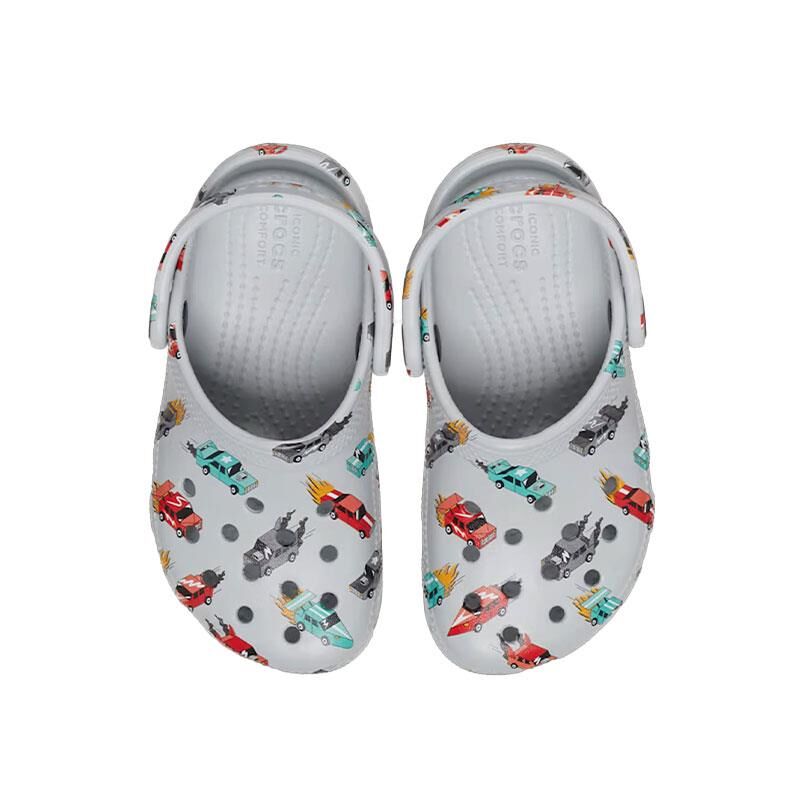 Crocs Classic Race Cars Graphic Cg T çocuk sandalet, yarış arabası temalı grafik tasarımıyla minik hız tutkunlarına özel olarak geliştirildi. Hafif ve rahat Croslite™ malzemesiyle üretilen bu model, gün boyu konfor sunar. Delikli üst yüzeyi sayesinde hava sirkülasyonu sağlar, Jibbitz™ uyumluluğu ile kişiselleştirilebilir. Gri zemin üzerine renkli araba grafik baskıları ile enerjik ve eğlenceli bir görünüm sunar.