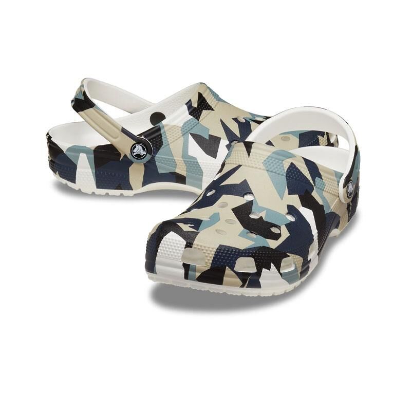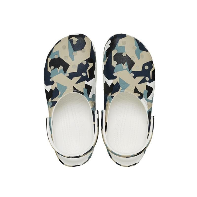 Crocs Geo Camo Clog Kadın Sandalet 211009-94S, klasik Crocs rahatlığını modern kamuflaj desenle buluşturarak dikkat çekici bir stil sunar. Beyaz zemin üzerindeki geometrik desen detaylarıyla öne çıkan bu model, hafif yapısı ve ikonik delikli üst yüzeyiyle maksimum hava alabilirlik sağlar. Ayarlanabilir arka kayışı sayesinde hem sandalet hem de terlik formunda kullanılabilir.