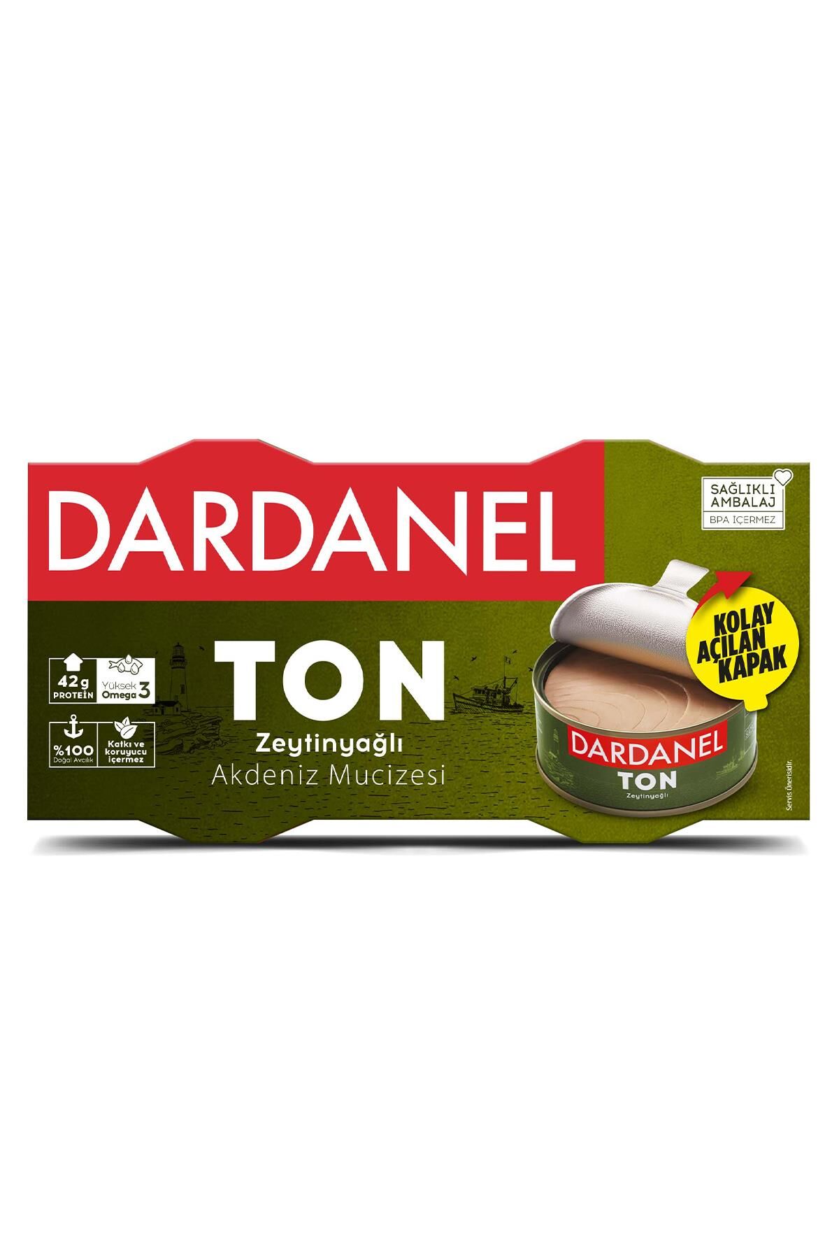 Dardanel Zeytin Yağlı Konserve Ton Balığı 2 x 140 gr, Klasik Dardanel lezzetinin, zeytinyağı lezzetiyle buluşması. %100 katkısız ve doğal, bütün dilim Ton Balığı! Yüksek omega-3 ve protein kaynağı Dardanel konserve ton balığı ile balığın sağladığı lezzet ve faydalara pratik bir şekilde ulaşabilirsiniz. Oda sıcaklığında TETT'ye kadar saklanabilir. Açıldıktan sonra, ürün üzerini yağ ile kaplayarak, ağzı kapalı bir şekilde buzdolabında (4°C) saklanması ve en fazla 2 gün içerisinde tüketilmesi tavsiye edilir. Doğrudan tüketilebilir. Sızıntılı ve bombajlı kutuları tüketmeyiniz.