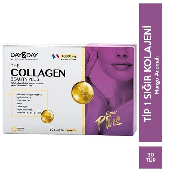Day2Day The Collagen Beauty Plus 10.000 mg kolajen peptit, hyaluronik asit, glutatyon, koenzim q10, yeşil çay, vitamin ve mineral kompleks içeren likit yapıda içilebilir gıda takviyesidir. Day2Day The Collagen Beauty Plus içerisinde sığır kaynaklı tip I kolajen bulunur. Molekül ağırlığı 2kda=2000 daltondur.