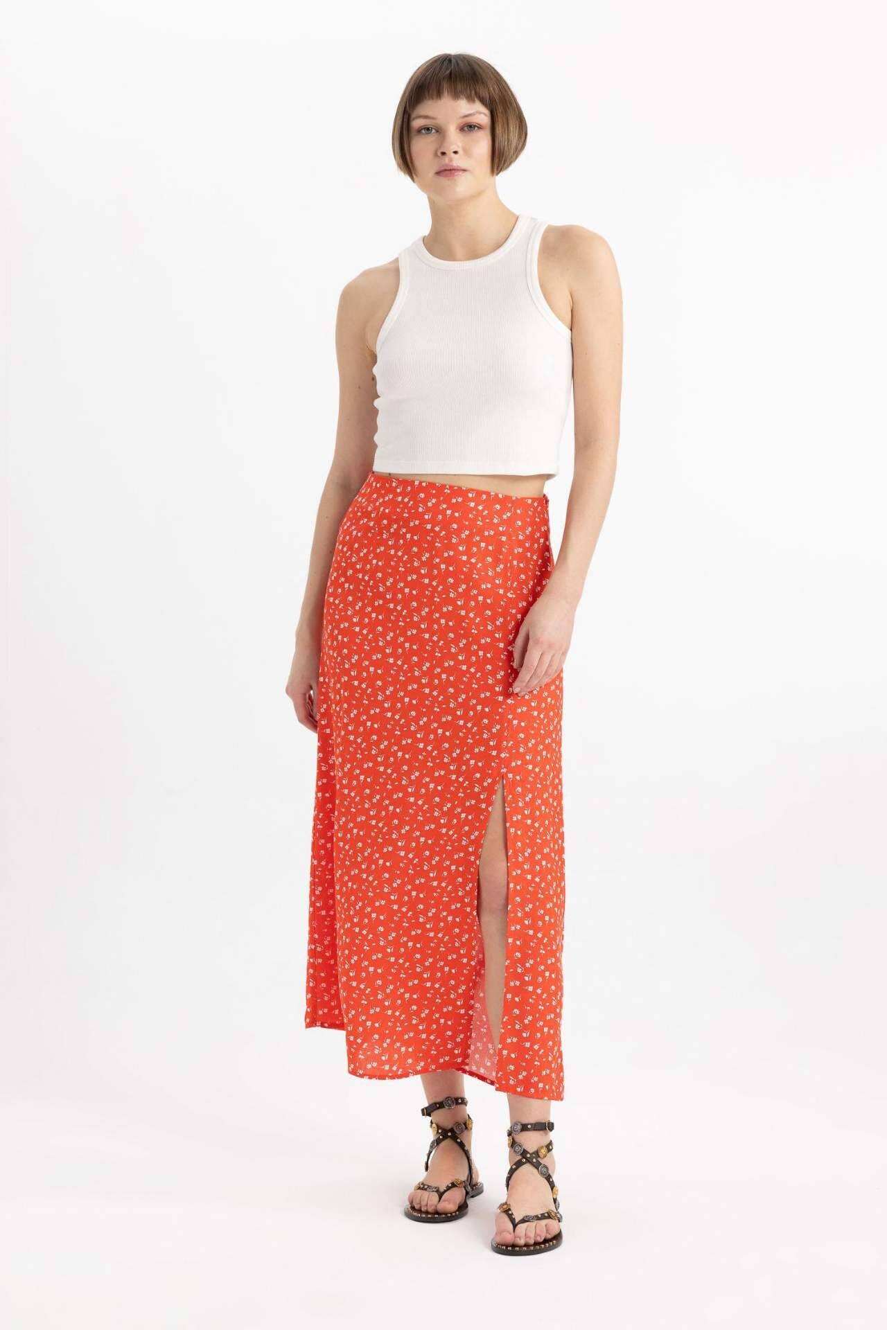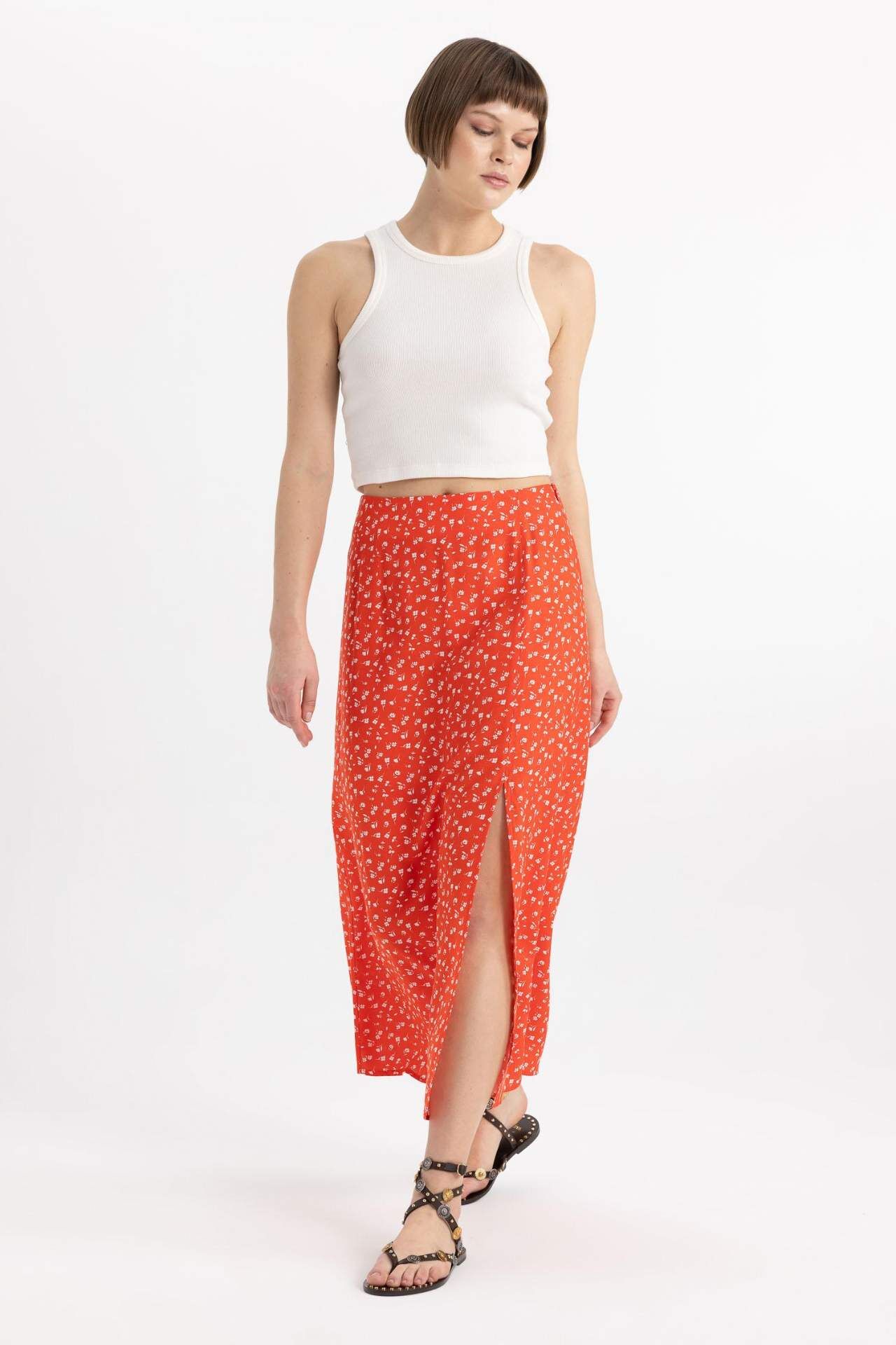 DeFactoFit A Kesim Çiçekli Normal Bel Yırtmaçlı Midi Etek