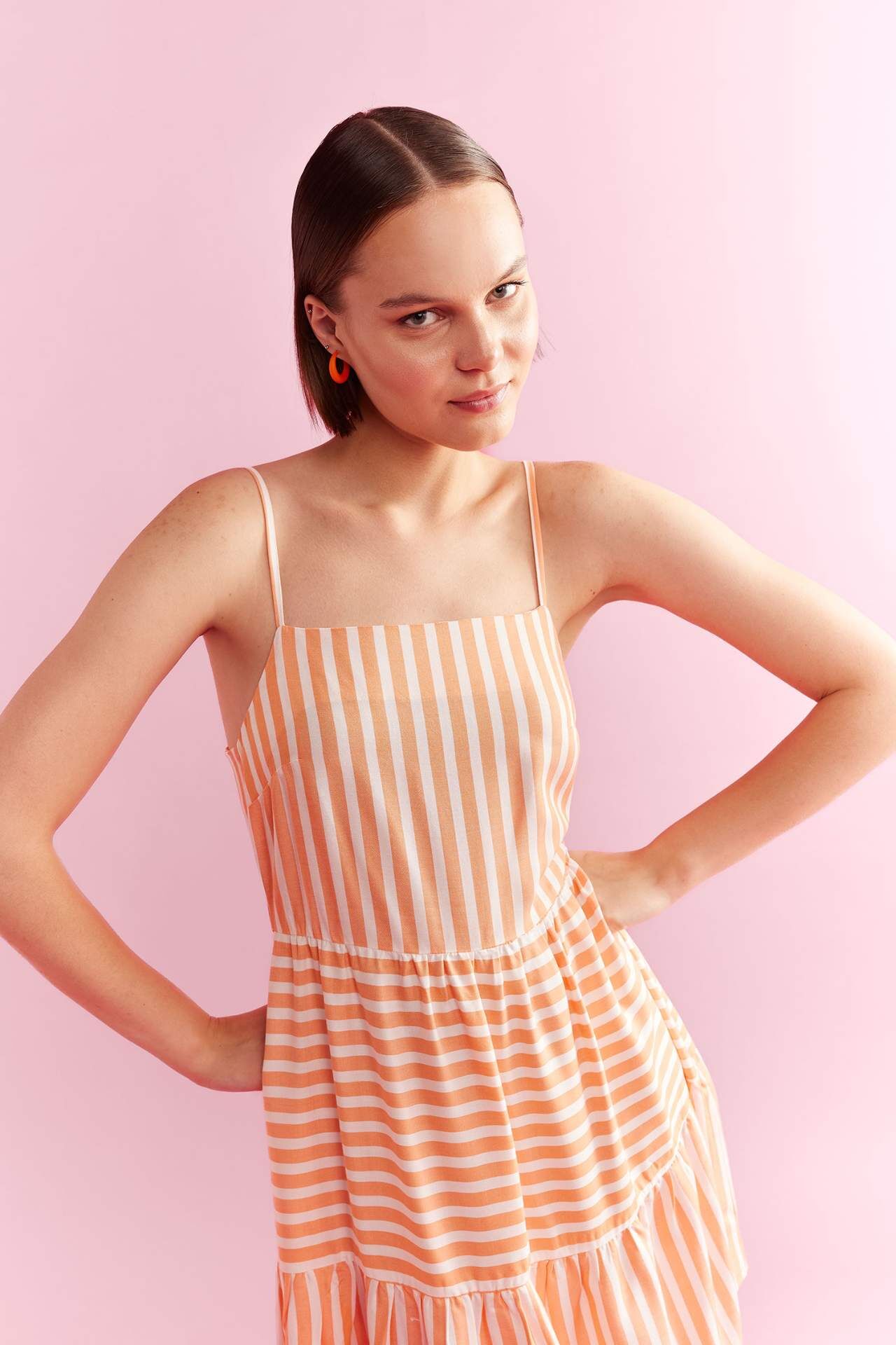 Çizgili, bisiklet yaka, volanlı ve askılı trend bir görünümü olan, şık ve rahat giyinmeyi seven kadınlar için tasarlanmış, günlük kombinlerinizde her ortamda tercih ederek stil sahibi görünebileceğiniz, rahat viskon yapısıyla DeFacto Kadın A Kesim Çizgili Mini Kısa Kollu Elbise. Viskoz 100%,Viskoz 100% Manken Bedeni: Göğüs: 79 Boy: 1,77 Basen: 89 Bel: 59