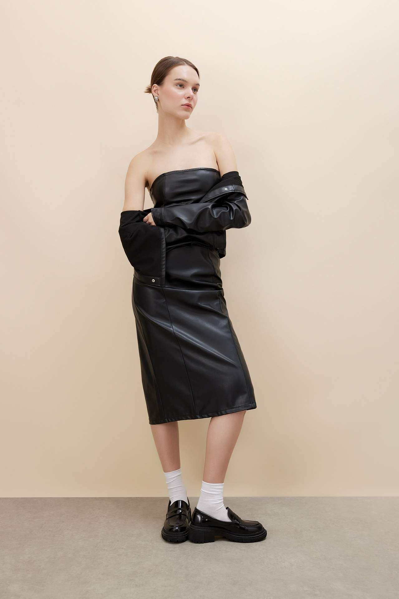 Bu şık bodycon elbise, güneşli günlerde stilinizi tamamlamak için mükemmel bir seçenektir. Straplez tasarımı ve midi boyuyla, zarif bir görünüm sunar. Suni deri malzemesi, elbiseye lüks bir dokunuş katar. Kısa kollu kesimi, rahatlık ve şıklığı bir araya getirir. Bu elbiseyle herhangi bir özel etkinlikte veya gece dışarı çıkarken göz kamaştırın. Poliester 100%,Polivinil Klorür 100%,Poliester 100%,Polivinil Klorür 100% Manken Bedeni: Göğüs: 81 Boy: 1,79 Basen: 88 Bel: 59