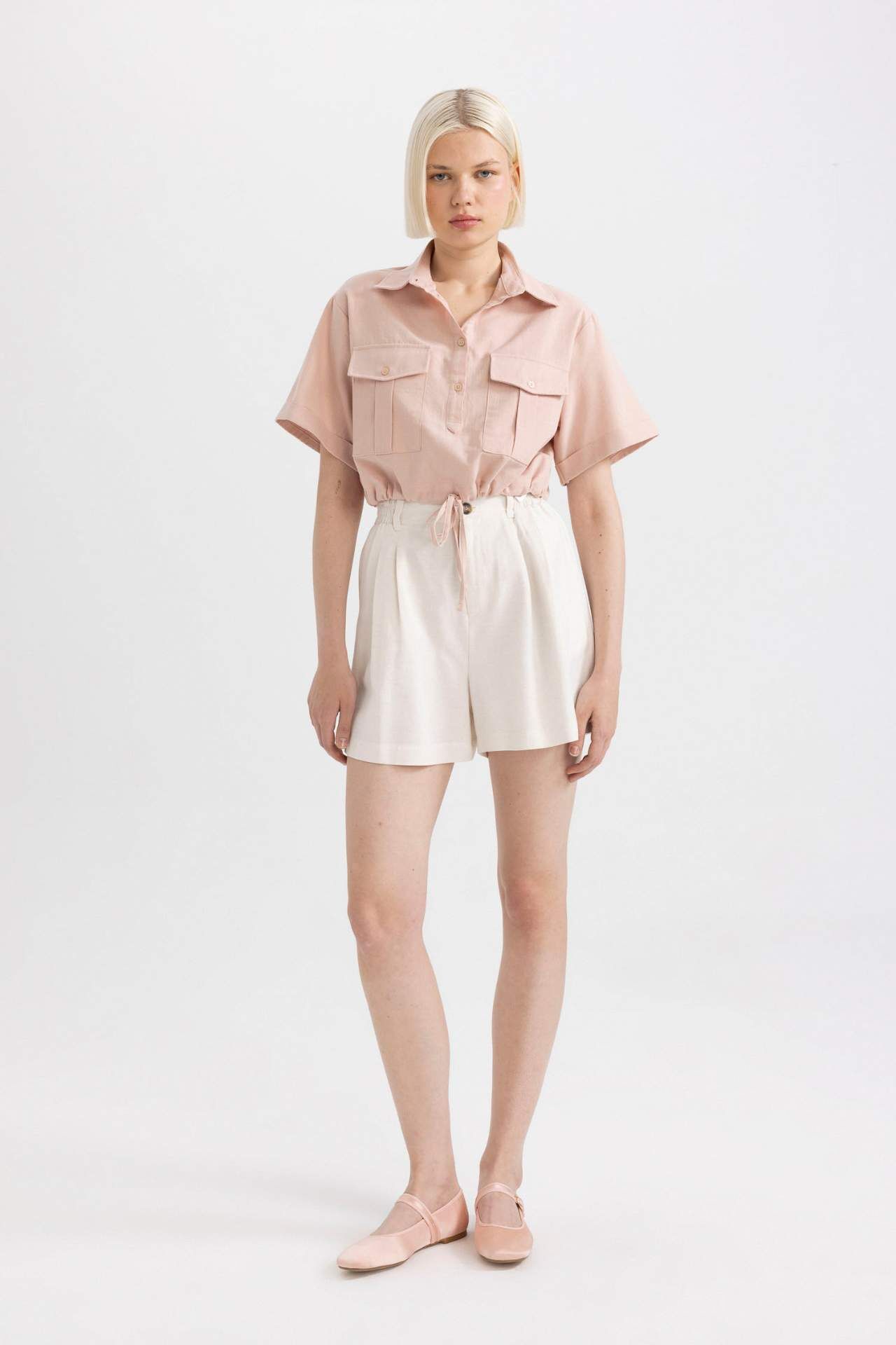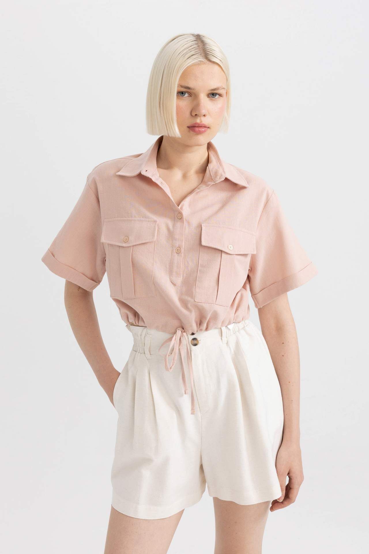 DeFactoFit Crop Gömlek Yaka Keten Karışımlı Kısa Kollu Bluz