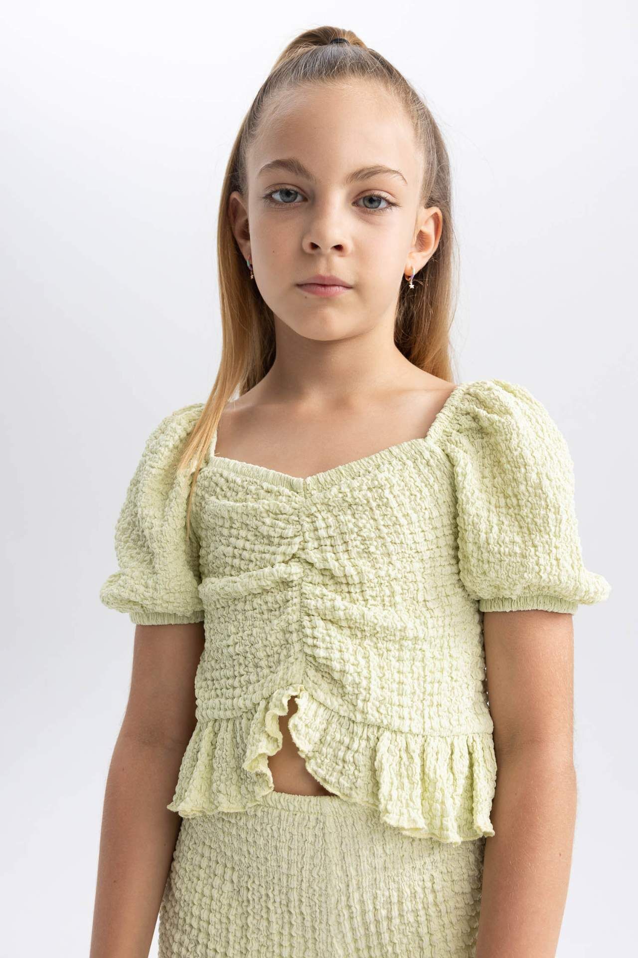 Bürümcüklü kumaşı, kare yaka, kısa kollu crop göbeği açık şık modeli ile sıcak yaz aylarında tatillerde, gezilerde etek ve şortlarınızla kombinleyeceğiniz uçuş uçuş modeli ile tercihiniz olacak DeFacto Kız Çocuk Crop Top Kısa Kollu Tişört. Elastan 1%,Poliester 99%,Elastan 1%,Poliester 99% Manken Bedeni: Göğüs: 0 Boy: 1,36 Basen: 0 Bel: 0