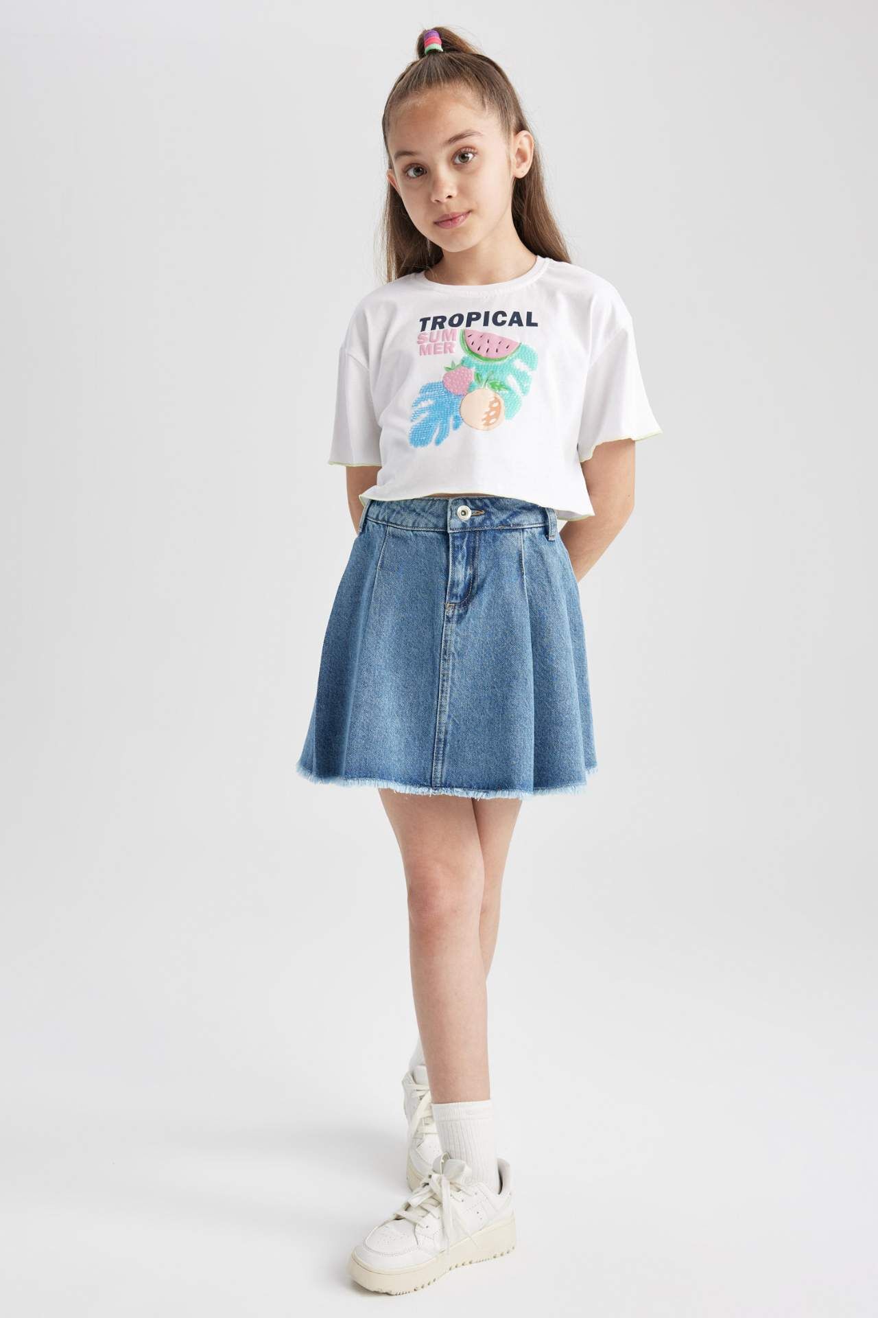 Jean kumaşı, fermuar ve düğme kapamalı, etek ucu pis uç detaylı bel içi ayarlanabilir lastikli, kısa boyu rahat modeli ile crop tişört ve gömlerklerinizle kombinleyeceğiniz, okulda, gezilerde ve doğum günlerinde tercih edeceğiniz sneaker spor ayakkabılarınızla uyum içinde olacağınız DeFacto Kız Çocuk Jean Etek. Pamuk 100%,Pamuk 100%