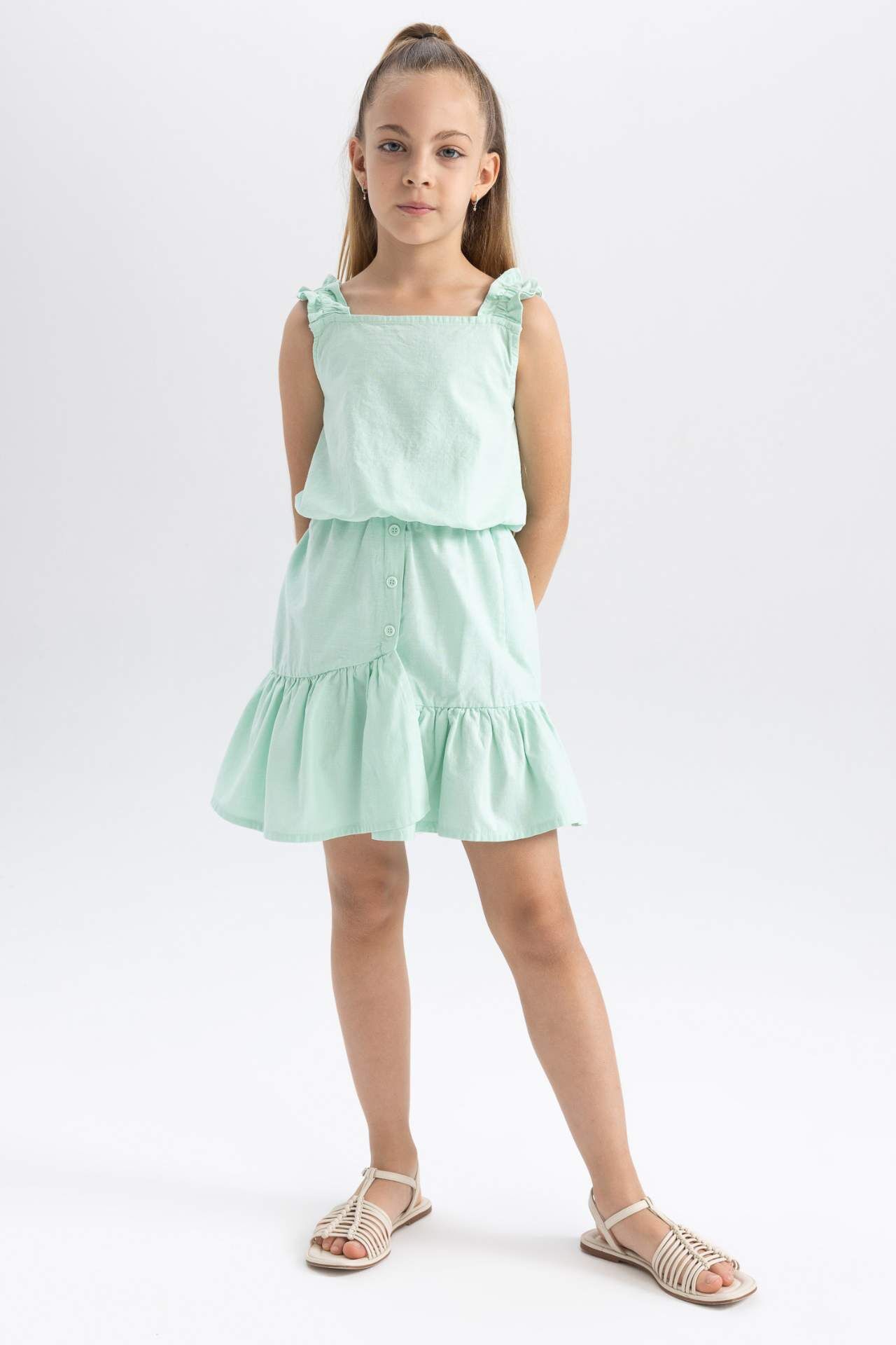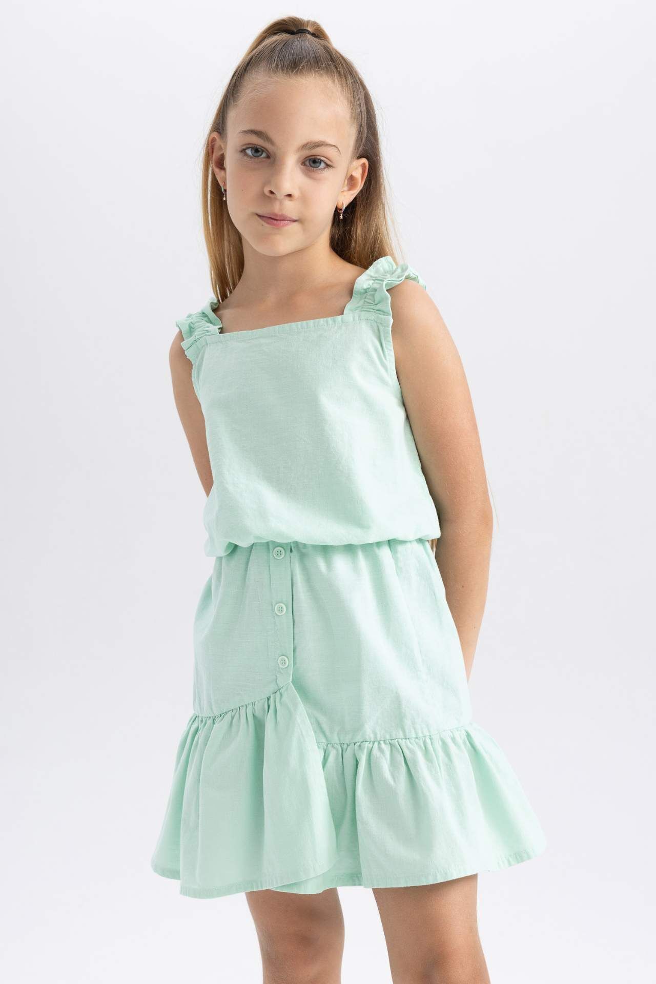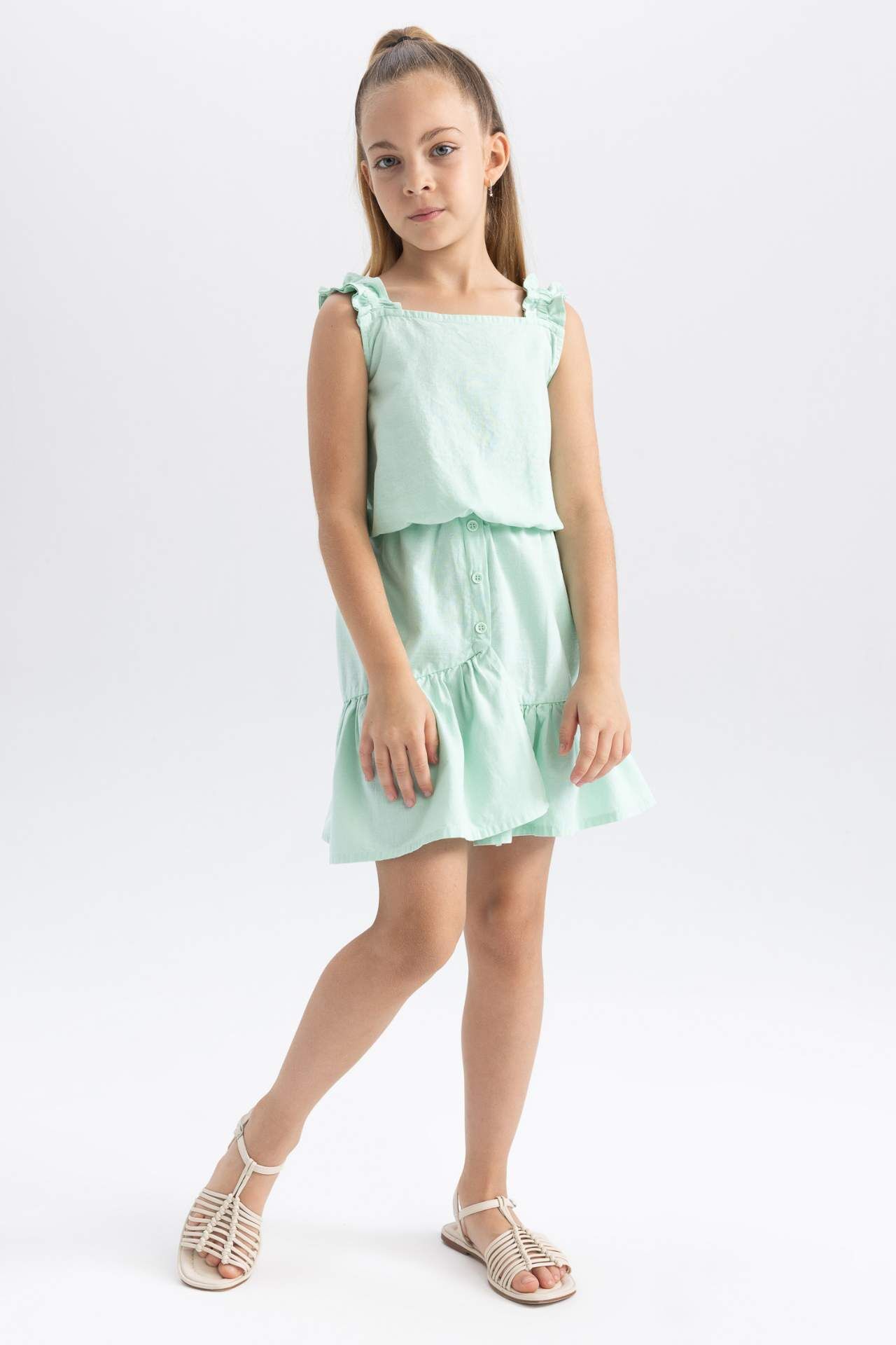Yaz aylarının ve tatillerin vazgeçilmezi olan 2li etek takımlar birbirinden şık tasarımları ile DeFacto da seni bekliyor! Pamuklu kumaşı, bisiklet yaka, kolsuz üst bluzu, esnek belli volanlı eteği ile okulda, törenlerde ve tatillerde sandeletlerinizle uyum içinde olacağınız DeFacto Kız Çocuk Kolsuz Bluz Etek 2'li Takım. Pamuk 100%,Pamuk 100%