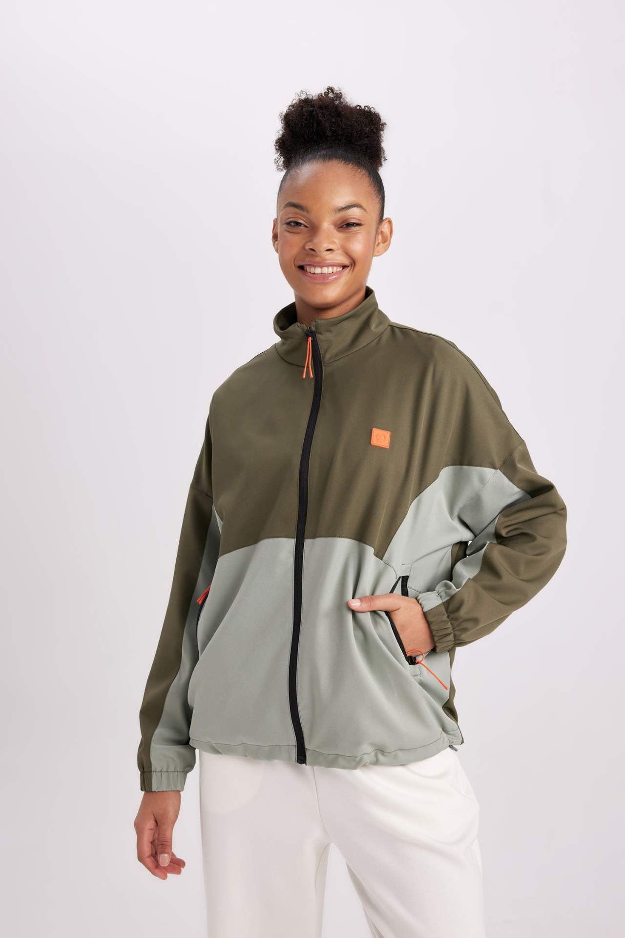 Dik yakalı, çift renkli ve fermuar kapamalı spor modeli ile serin havaların spor kombininin en önemli parçası ile fit bir görünüm sağlayan, form duruşu ile tarzınızın tamamlayıcı parçası olacak DeFactoFit Su İtici Regular Fit Ceket Mont.