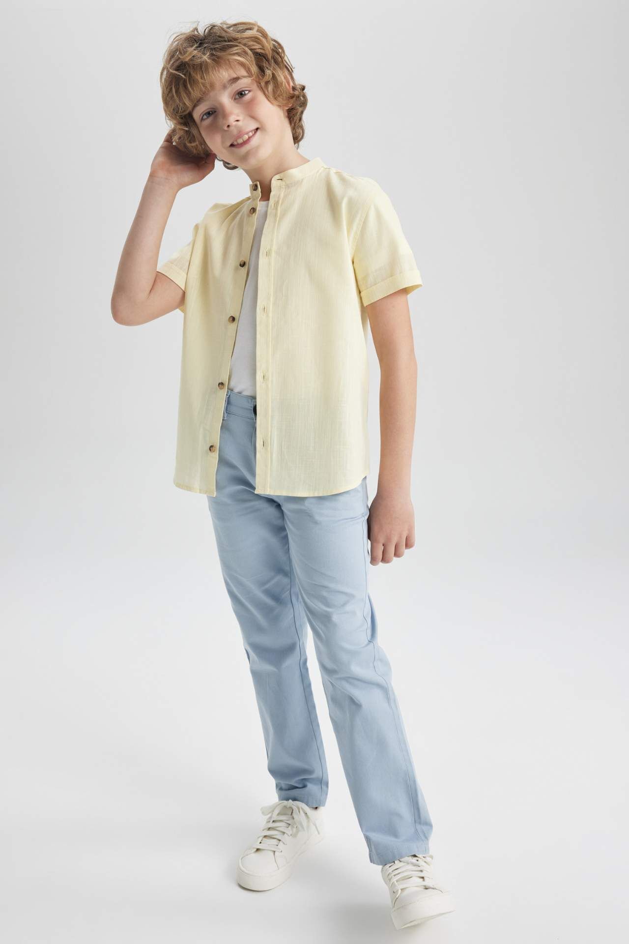 DeFactoFit Erkek Çocuk Dik Yaka Keten Görünümlü Kısa Kollu Gömlek Sarı