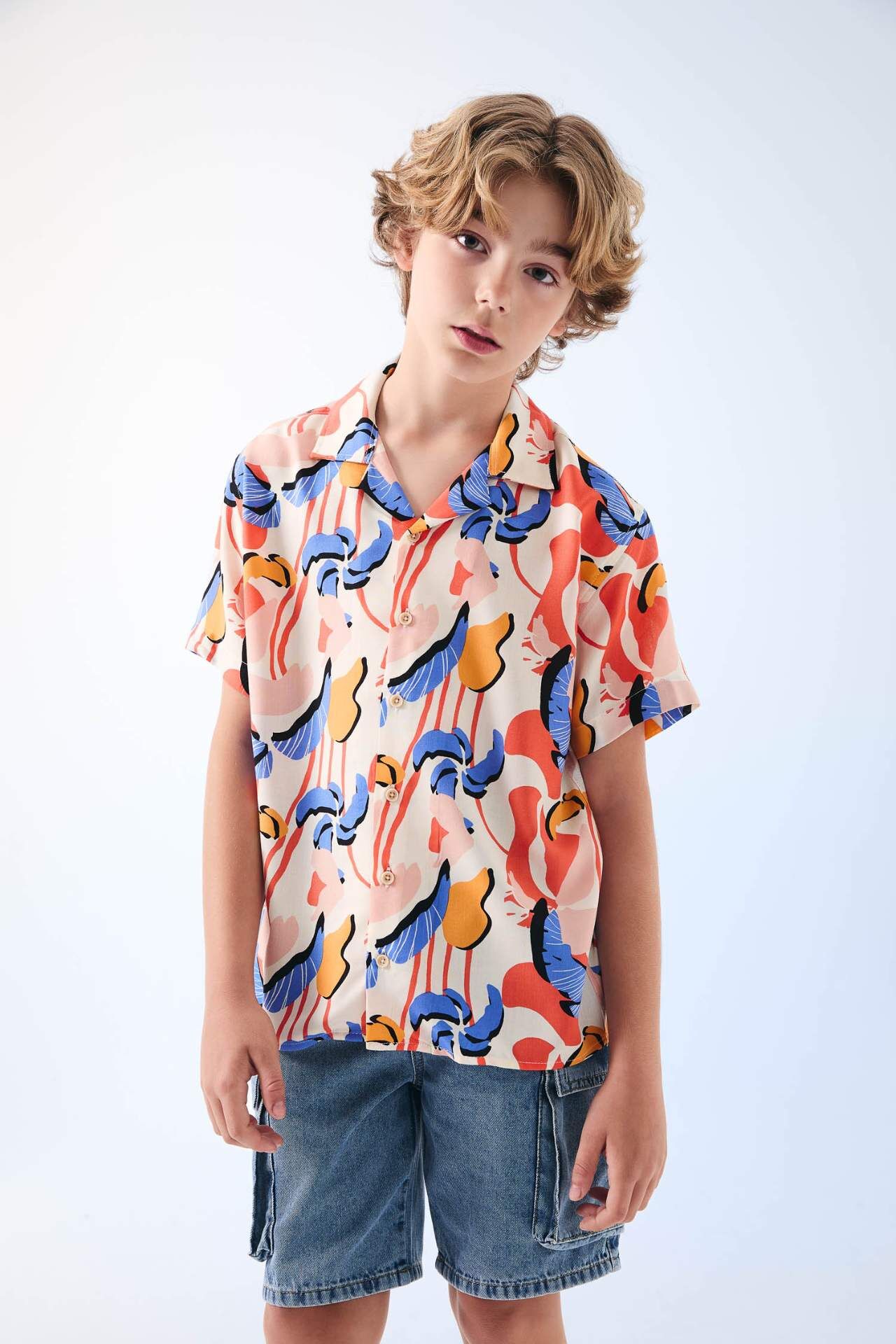 DeFactoFit Erkek Çocuk Oversize Fit Polo Yaka Desenli Viskon Kısa Kollu Gömlek