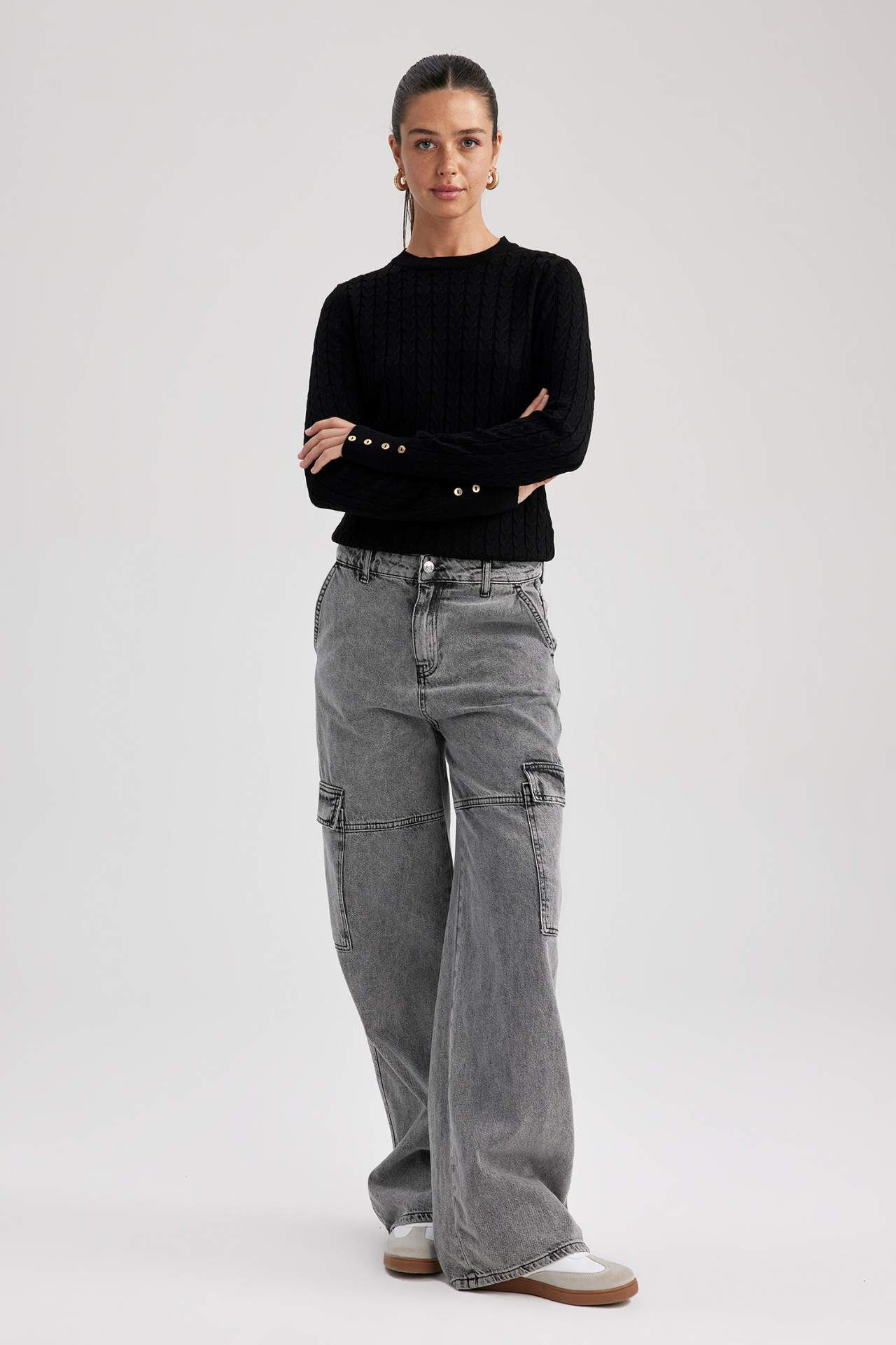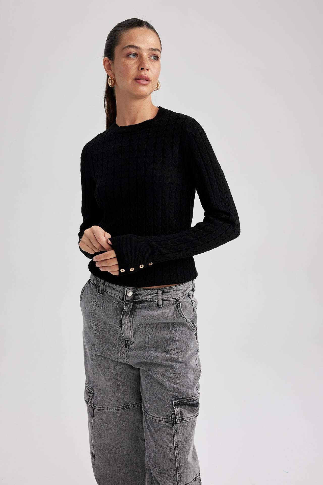 Şık bisiklet yaka modeli ve regular fit rahat kalıbı, kol üstü düğme detaylı tarz moda severlerin dolabında mutlaka olması gereken, ekstra yumuşacık dokusuyla, maxi etek, mini etek, yüksek belli jean pantolon, blazer ceket, dokuma pantolon, jean pantolon ve taytlarınızla rahatlıkla kullanabileceğiniz, hem günlük hem de klasik kıyafetlerinizle kombinleyebileceğiniz DeFacto Kadın Fitted Bisiklet Yaka Kazak. Akrilik 100% Manken Bedeni: Göğüs: 81 Boy: 1,75 Basen: 88 Bel: 60
