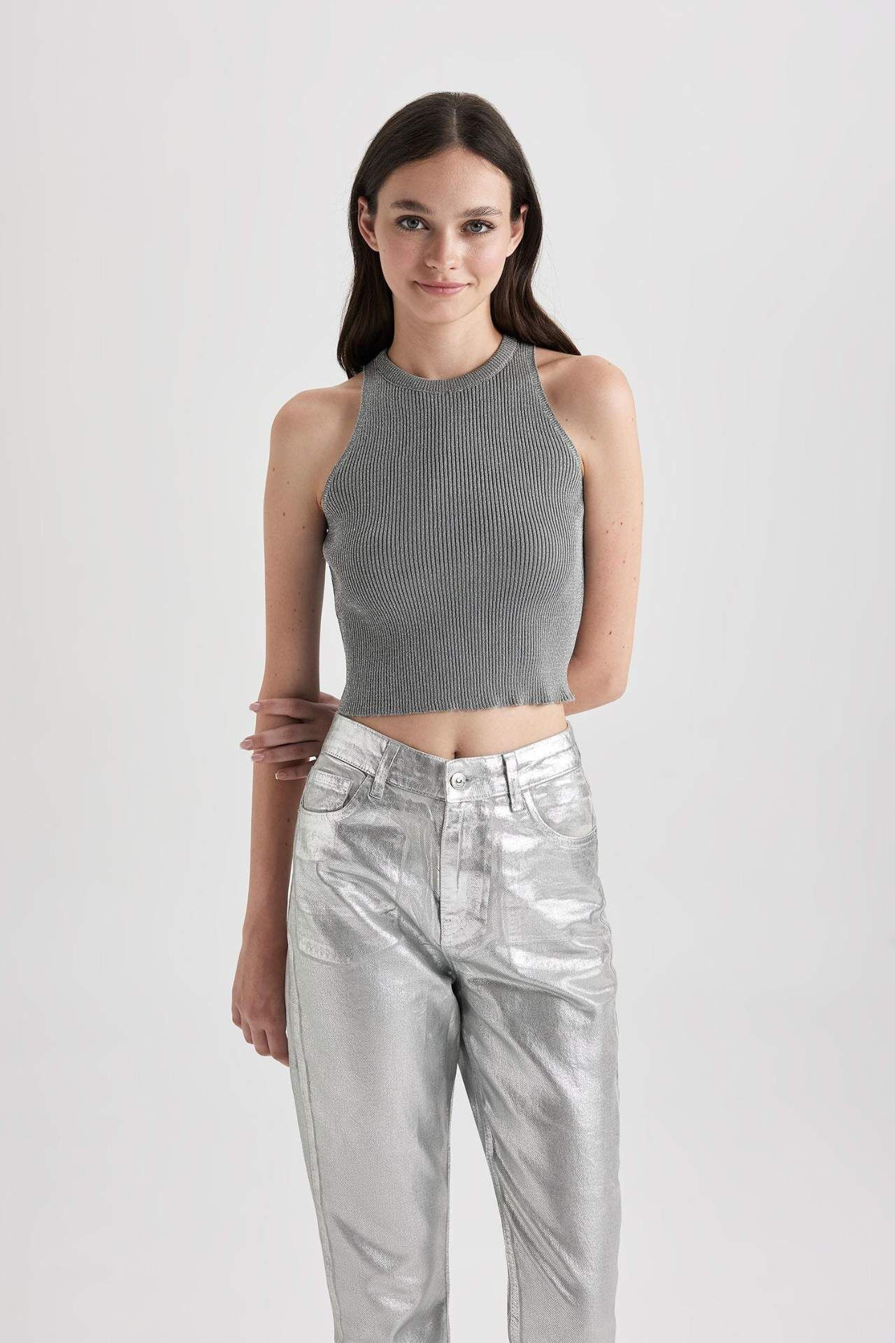 Fitted Halter Yaka Parlak Kumaş Crop Atlet, zarif ve çarpıcı bir görünüm elde etmek isteyenler için ideal tasarımıyla şıklık ve rahatlığı bir araya getiren özel bir üst giyim parçasıdır. Metal Elyaf 11%,Poliester 89%,Metal Elyaf 11%,Poliester 89% Manken Bedeni: Göğüs: 82 Boy: 1,68 Basen: 92 Bel: 64