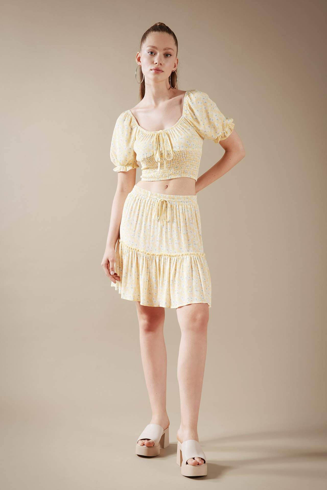 DeFactoFit Fitted Kare Yaka Baskılı Kısa Kollu Crop Bluz