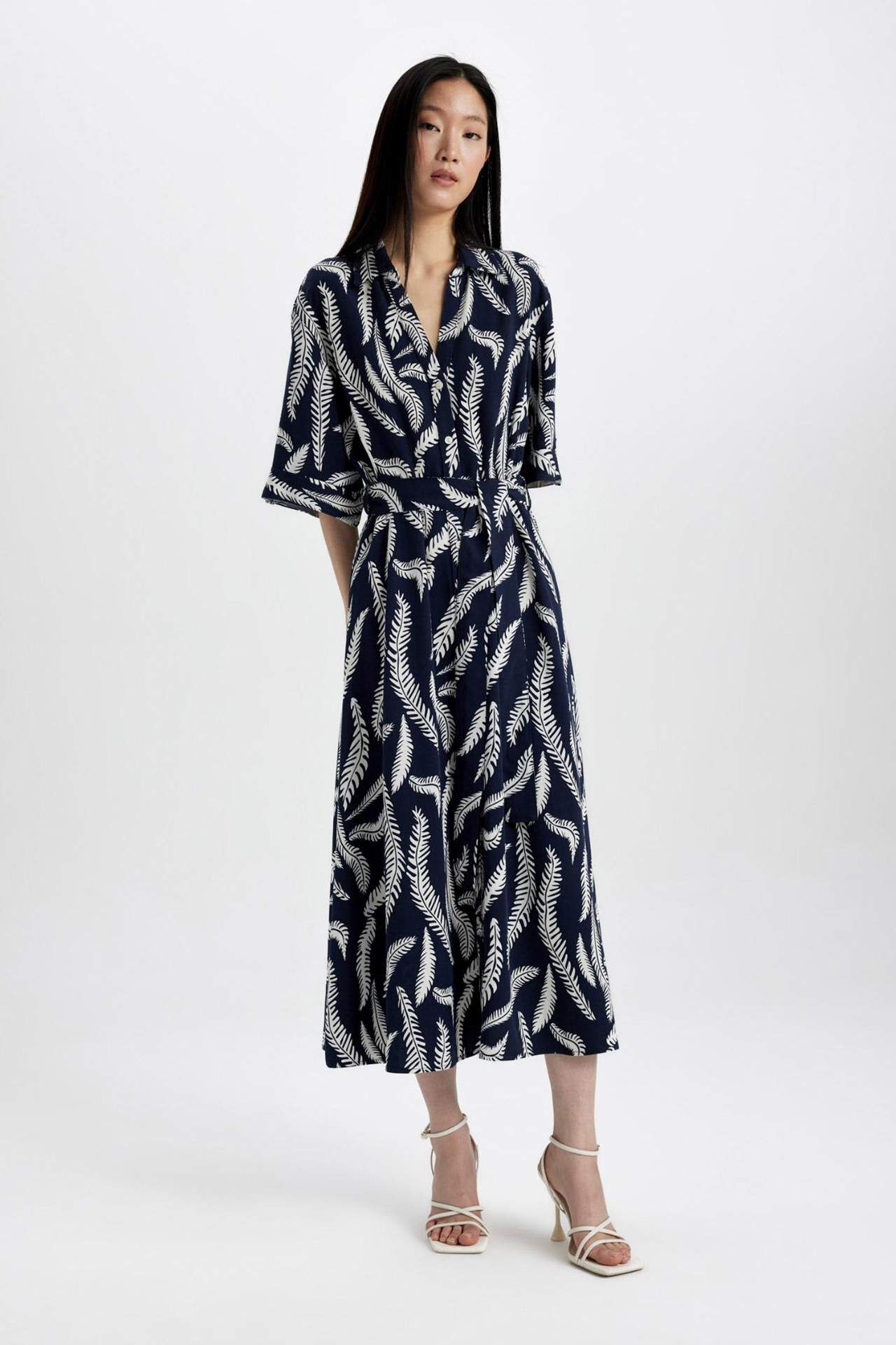DeFactoFit Gömlek Yaka Desenli Keten Karışımlı Kısa Kollu Midi Elbise