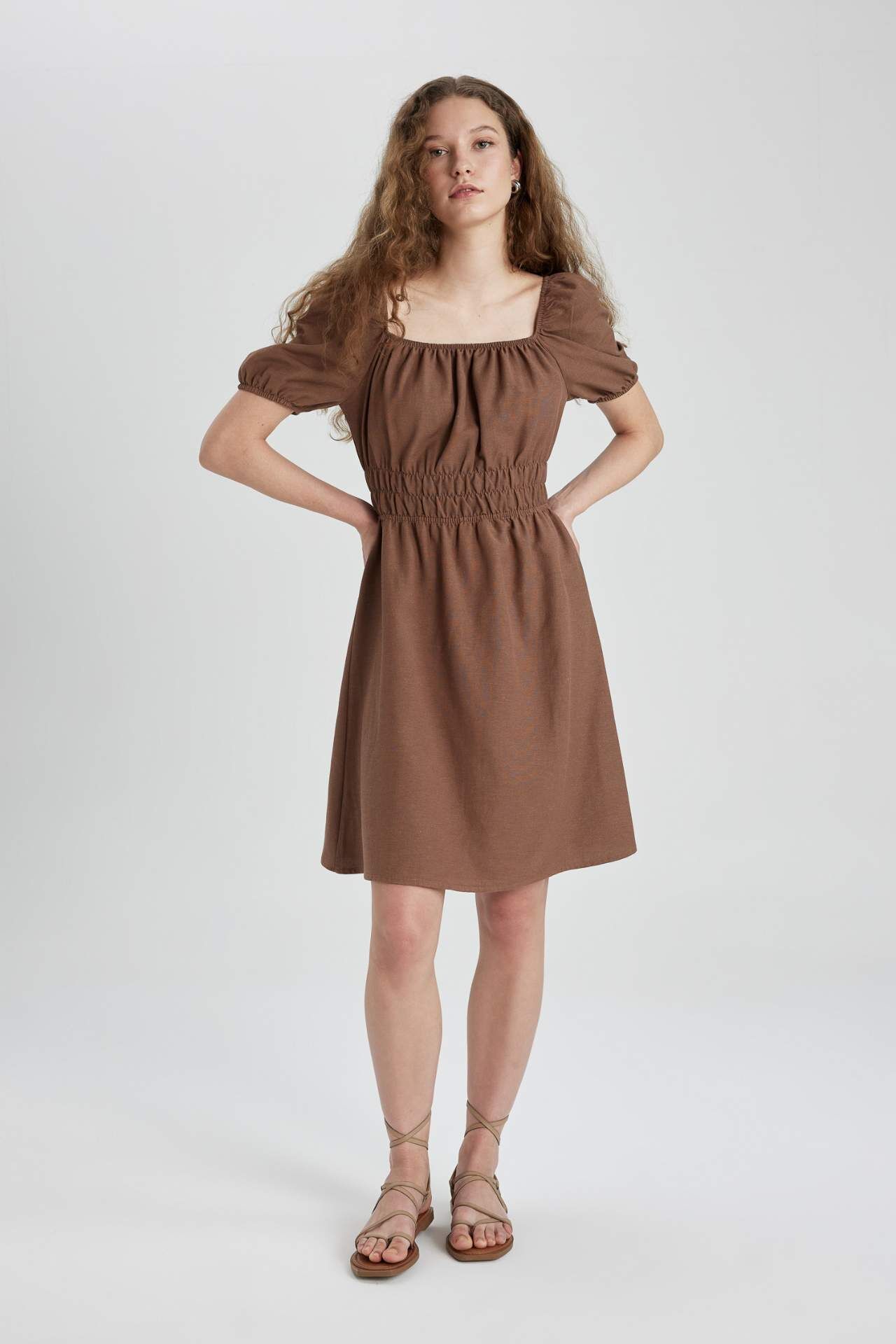 DeFactoFit Kare Yaka Keten Kısa Kollu Mini Elbise