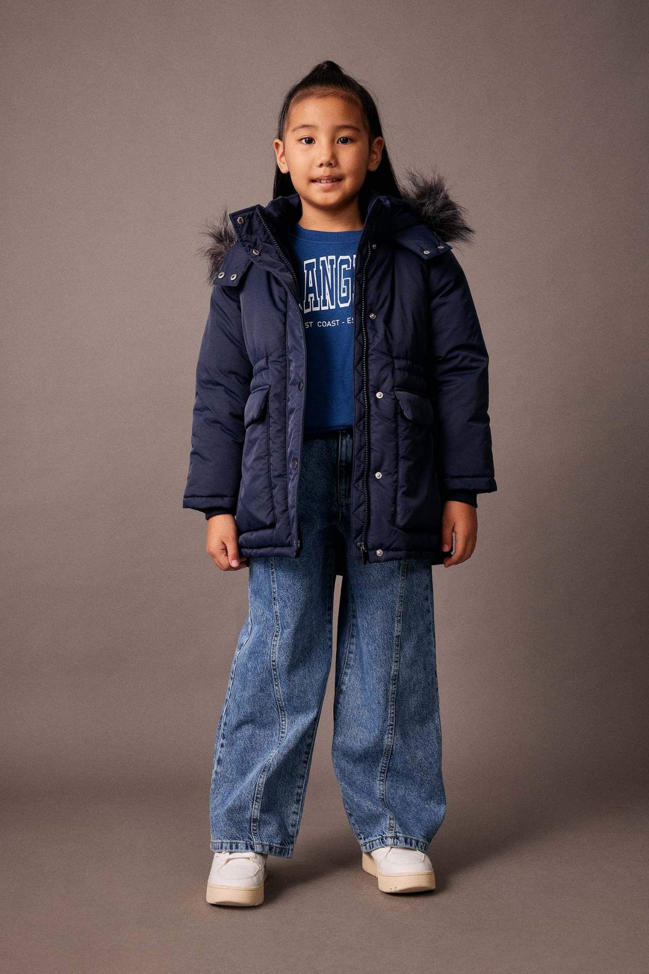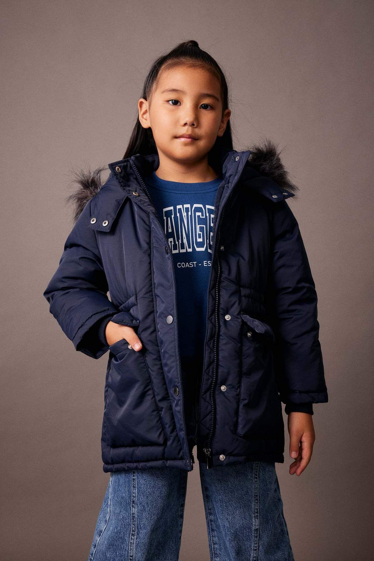 Kız Çocuk Kapüşonlu Suni Kürk Astarlı Mont