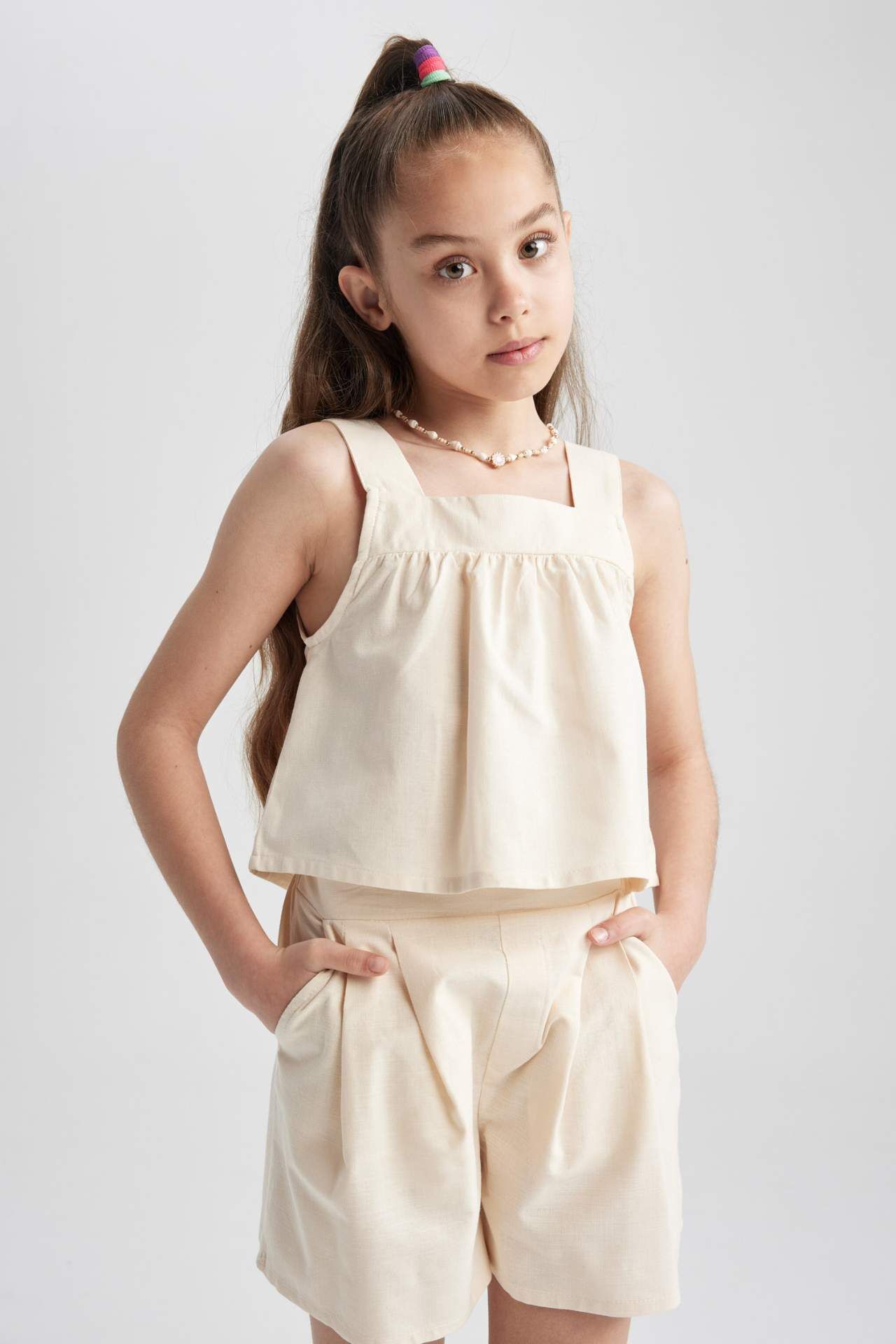 Spor modeli pamuklu penye kumaşı, kare yaka, kolsuz, kalın askılı atleti, esnek beli kısa şort alt modeli yaz aylarında tatillerde, gezilerde ve okulda spor ayakkabı ve sandaletlerinizle uyum içinde olacağınız DeFacto Kız Çocuk Kolsuz Bluz Şort 2'li Takım. Pamuk 100%,Pamuk 100%