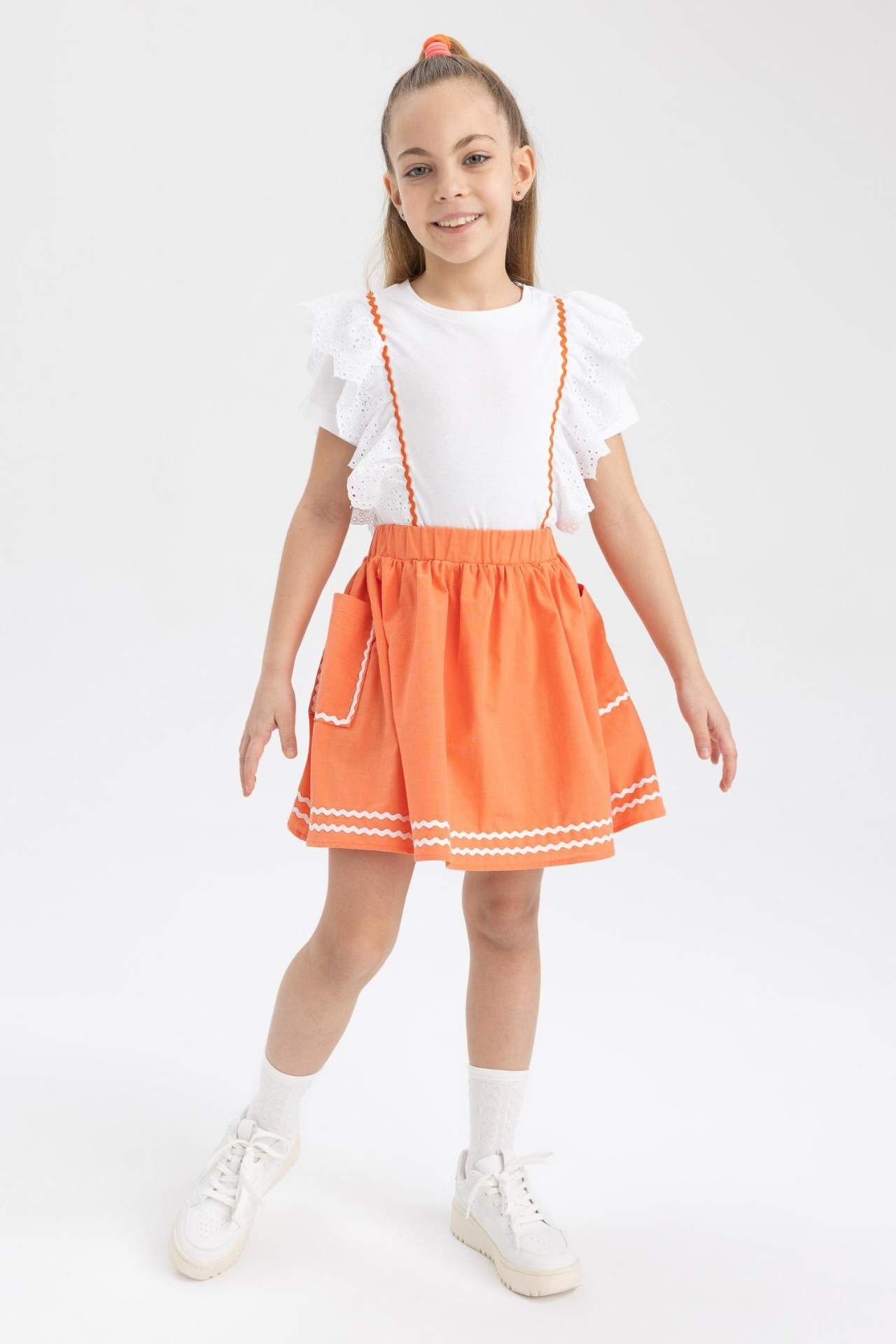 Pamuklu turuncu renkli, esnek belli, cepli ve süs şerit detaylı enerjik modeli ile yaz aylarında crop bluz ve tişörtlerinizle uyum içinde olacağınız, okulda gezilerde ve törenlerde renkli sandaletlerinizle tercih edeceğiniz DeFacto Kız Çocuk Pamuklu Etek. Pamuk 100%,Pamuk 100%