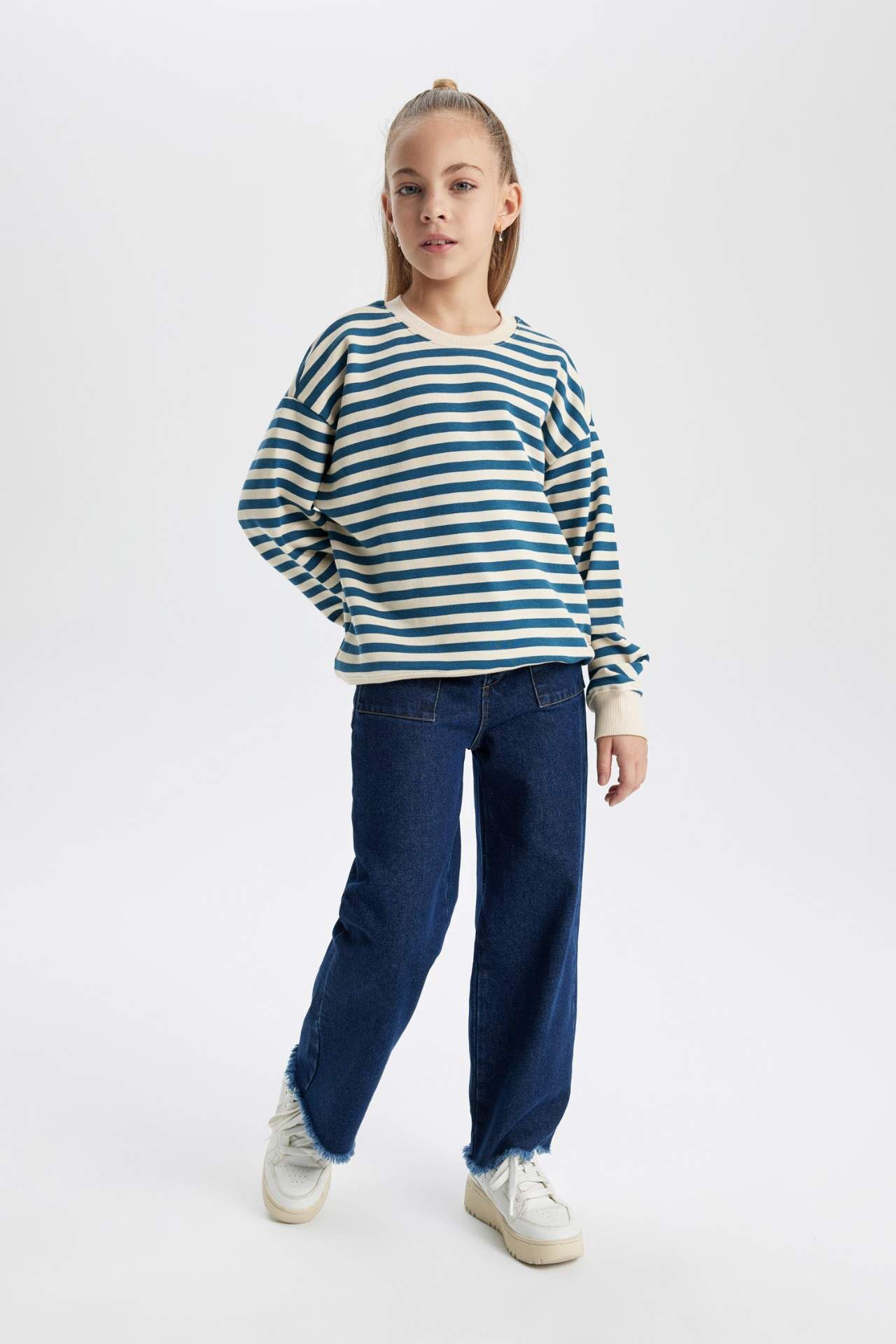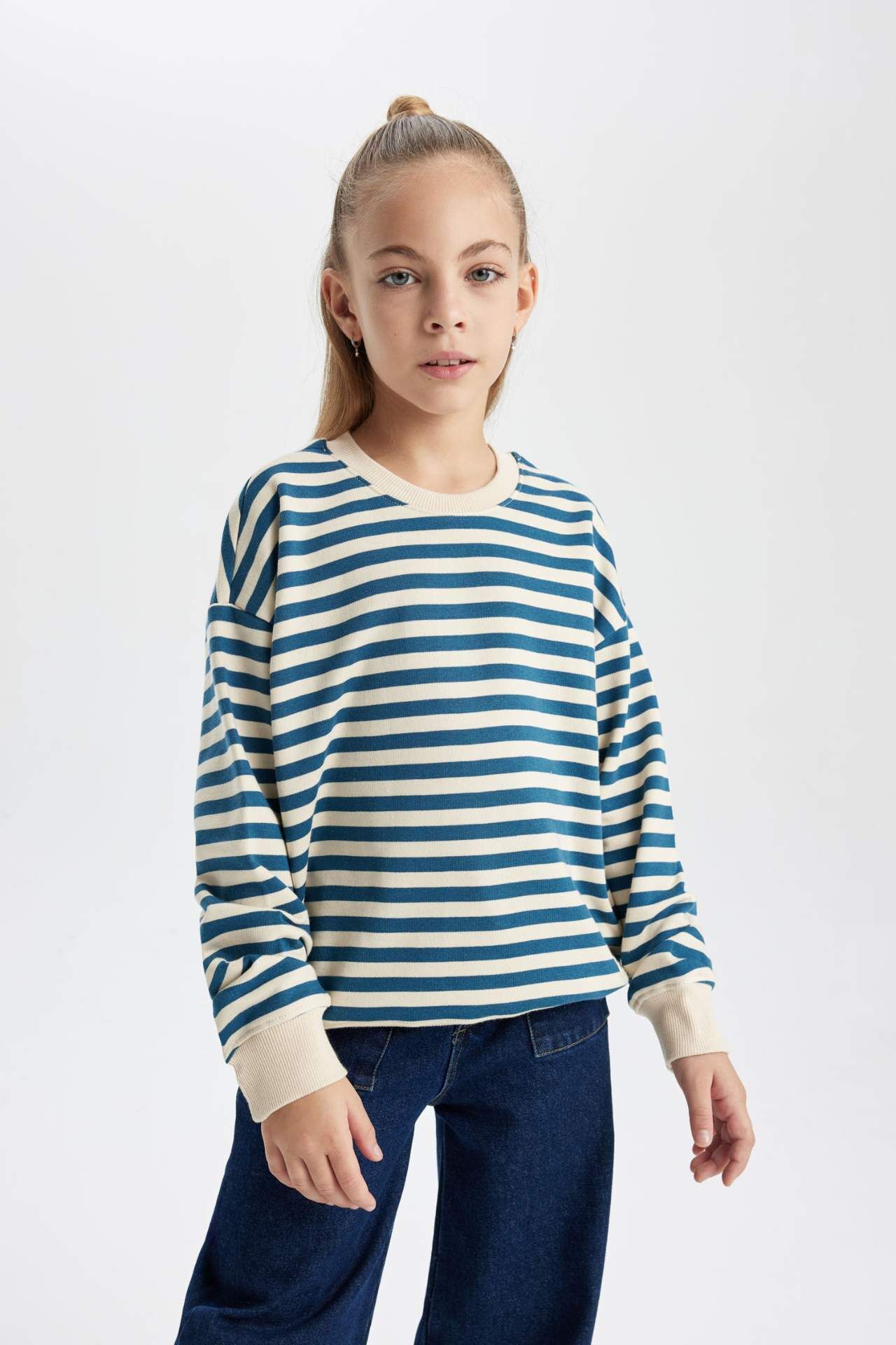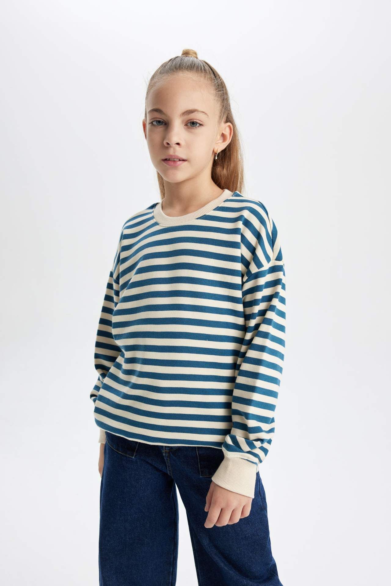 Sweatshirt ve Jogger Eşofman altlarını alarak tarzını yansıtmaya devam et! Pamuklu çizgili sweat kumaşı, bisiklet yaka,oversize fit bol kalıbı ,uzun kollu kol ucu etek ucu esnek ribana kumaşlı ve basic modeli ile tercihiniz olacak DeFacto Kız Çocuk Oversize Fit Sweatshirt. Pamuk 68%,Poliester 32%,Pamuk 68%,Poliester 32%