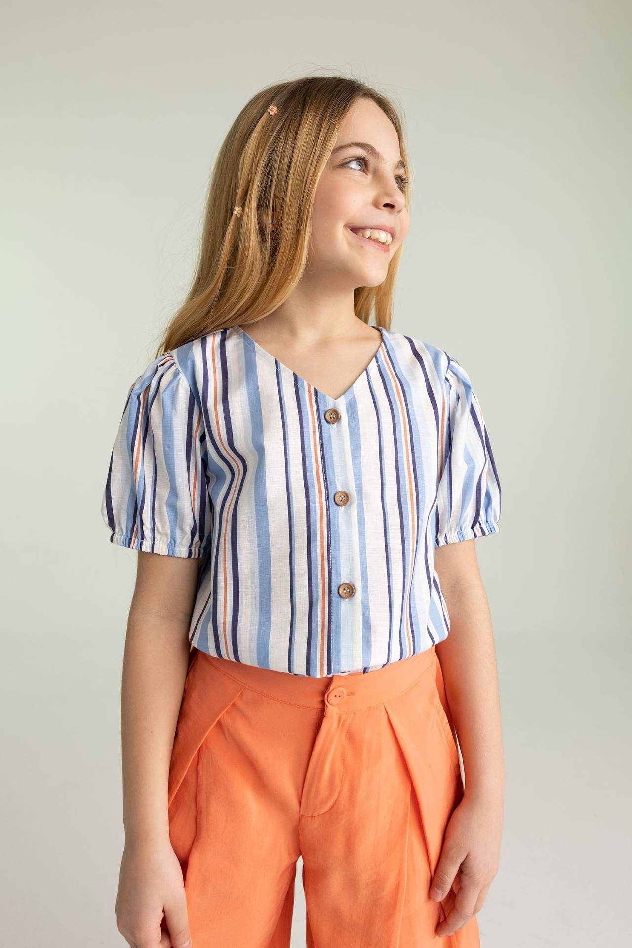 Pamuklu çizgili kumaşı, v yaka, düğme detaylı kısa kollu, cepli şık modeli ile okuldai gezilerde ve törenlerde etek ve şortlarınızla uyum içinde olacağınız DeFacto Kız Çocuk Regular Fit Desenli Pamuklu Kısa Kollu Gömlek. Pamuk 100%,Pamuk 100% Manken Bedeni: Göğüs: 0 Boy: 1,36 Basen: 0 Bel: 0