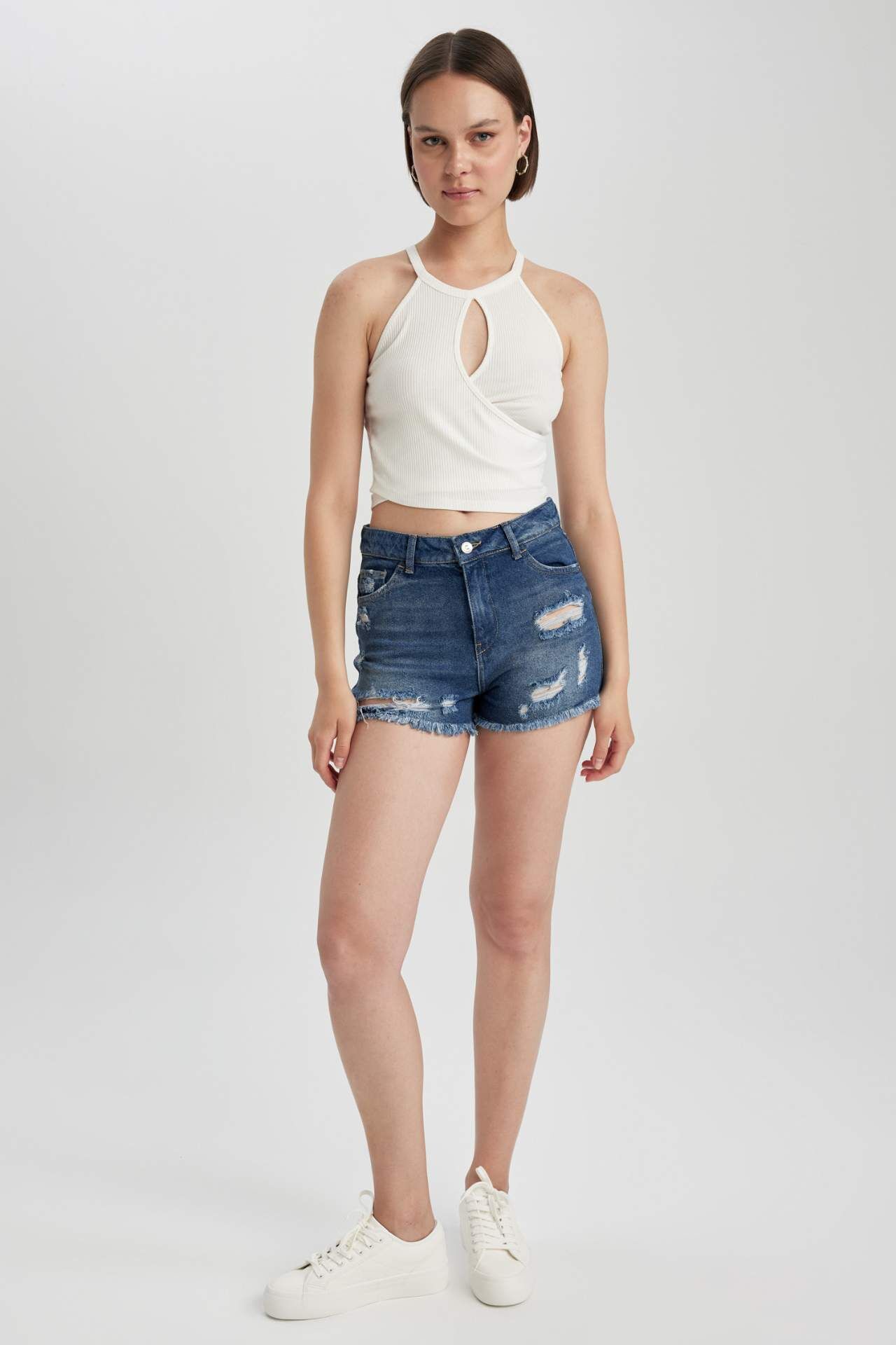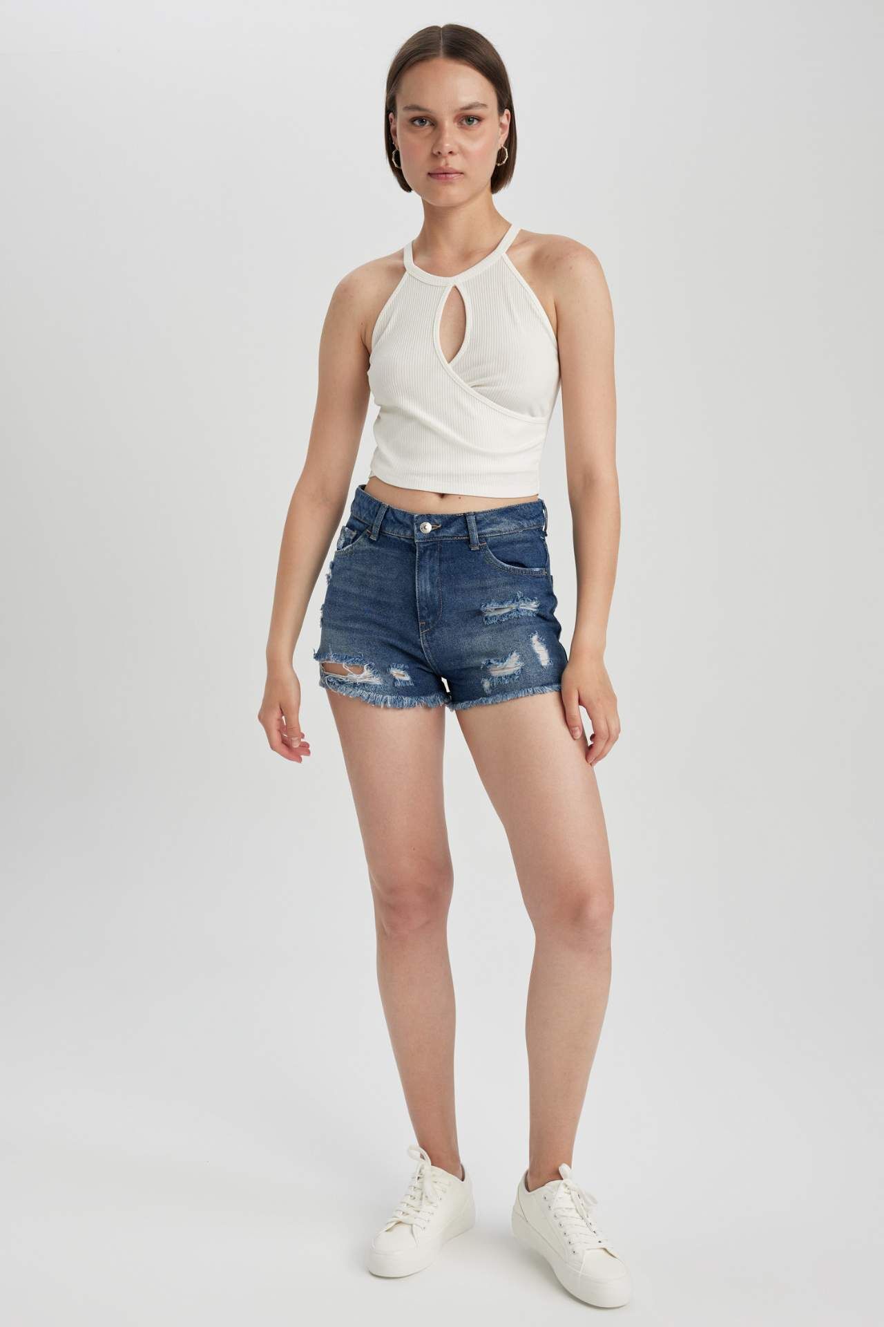 Mini boyu ile kendinden emin bir stil sunan, kullanışlı cepleriyle ve yırtık detaylı modeli ile gün boyu rahat hissedeceğiniz, basic tişört, crop sweatshirt, crop hırka, askılı atlet ve crop top modelleriyle rahatlıkla kombinlenebileceğiniz, tatil valizinizin en star parçası olacak, basic şıklığınızda spor bir uyum yakalayabileceğiniz, yırtık detayıyla DeFacto Kadın Normal Bel Kesik Uçlu Paça Jean Şort Pamuk 100%,Pamuk 100%