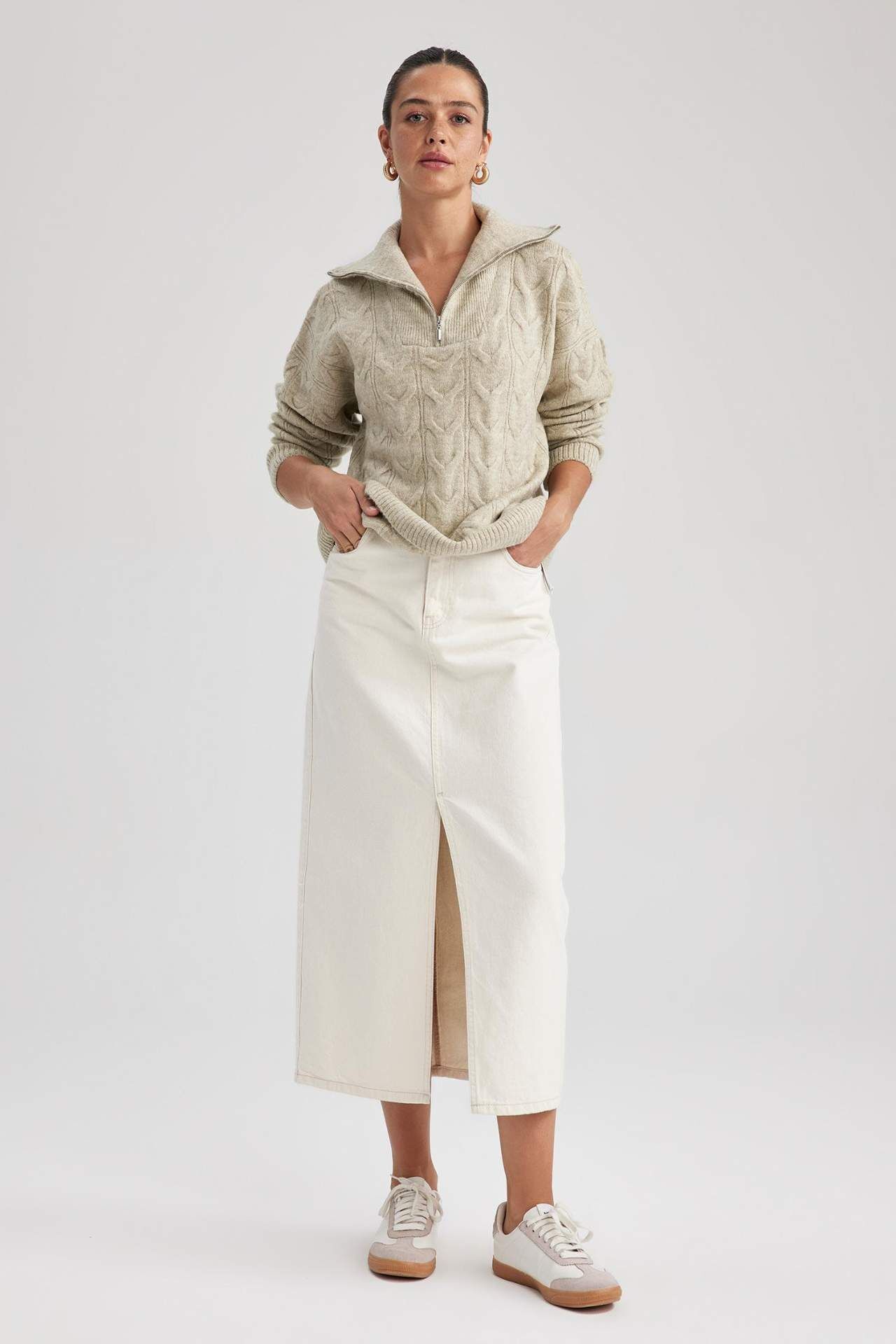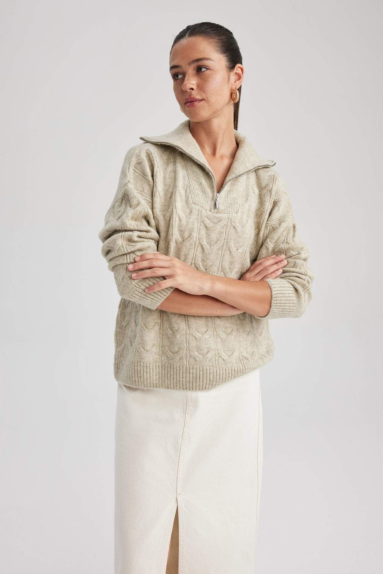 Fermuarlı yaka, basic modeli ve oversize rahat kesimi ile yüksek bel jean pantolon, mom fit jean, carrot fit pantolon, paper bag pantolon, midi etek, kalem etek, triko jogger pantolon, suni deri pantolon ve dokuma taytlarınızla kombinleyebileceğiniz, kış ve bahar aylarının en çok tercih edilen kullanışlı kombin parçası, yumuşak dokusuyla DeFacto Kadın Oversize Fit Fermuarlı Yaka Kazak. Akrilik 77%,Poliester 23%,Akrilik 77%,Poliester 23%