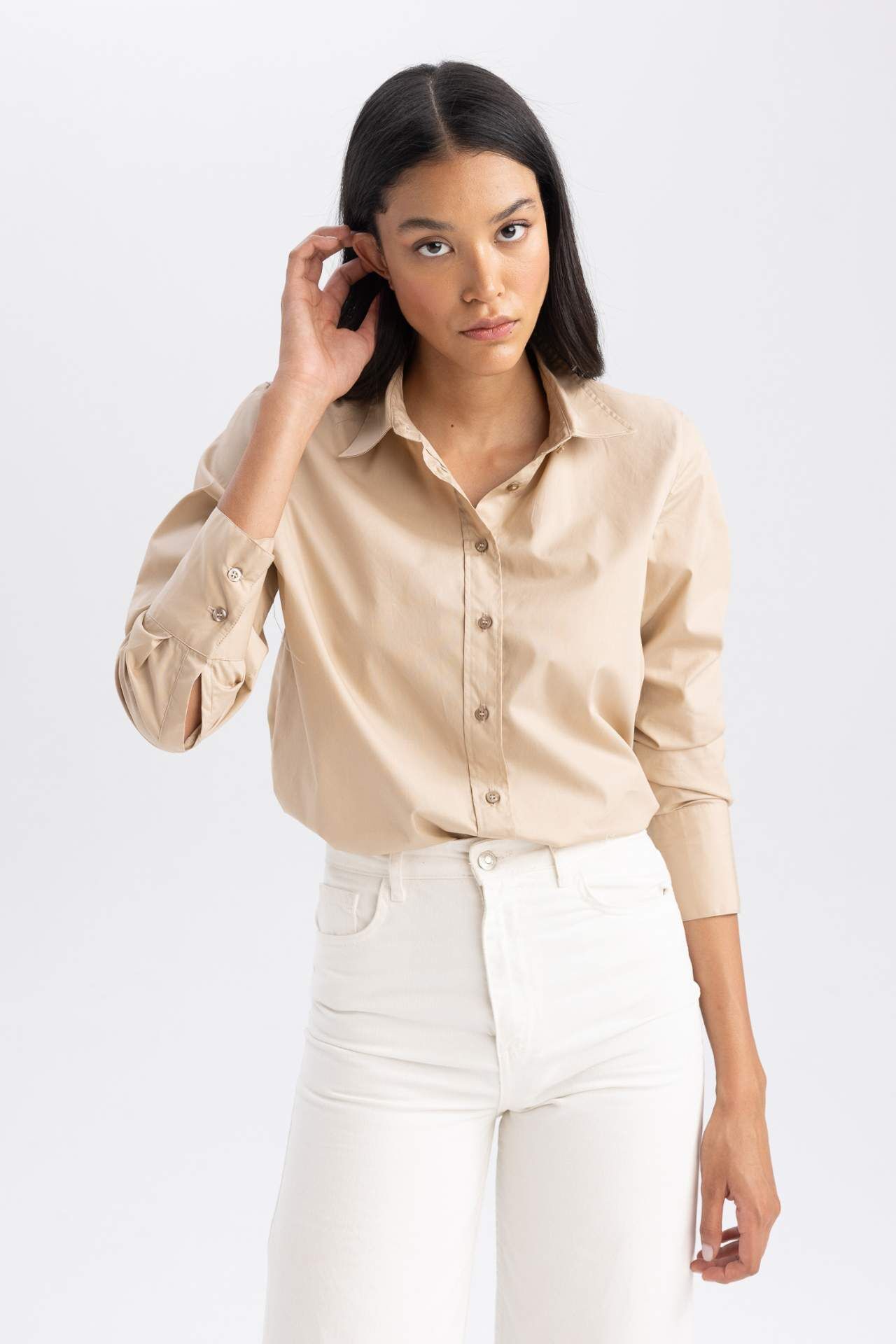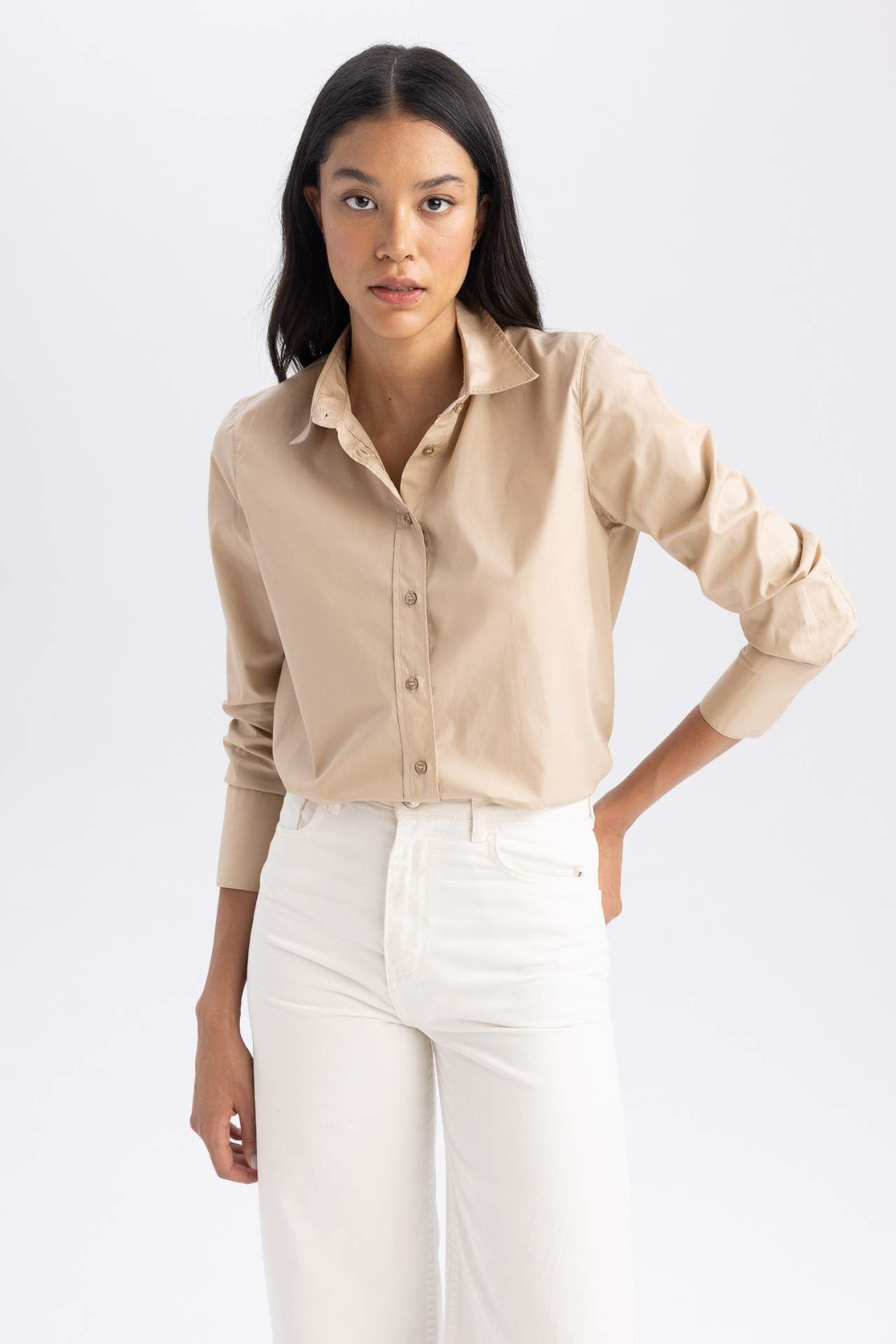 Trend oversize fit, basic tasarımı ve pamuk poplin kumaşı, rahat modeli ile her tarz tayt, jean ve dokuma pantolonlarınızla kombinleyebileceğiniz, her tarz için kullanışlı, düğmeli stil sahibi uzun kollu tasarımıyla hem günlük hem de klasik stilinizi tamamlayabileceğiniz, bahar ve yaz aylarının en aranan parçalarından DeFacto Kadın Oversize Fit Gömlek Yaka Poplin Uzun Kollu Gömlek. Pamuk 100%,Pamuk 100%