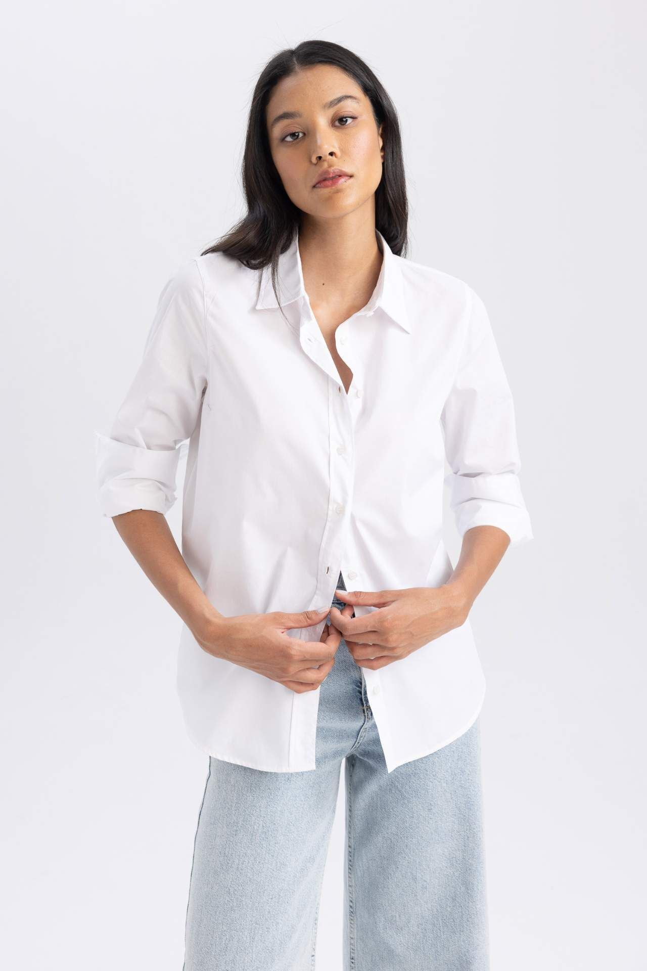 Trend oversize fit, basic tasarımı ve pamuk poplin kumaşı, rahat modeli ile her tarz tayt, jean ve dokuma pantolonlarınızla kombinleyebileceğiniz, her tarz için kullanışlı, düğmeli stil sahibi uzun kollu tasarımıyla hem günlük hem de klasik stilinizi tamamlayabileceğiniz, bahar ve yaz aylarının en aranan parçalarından DeFacto Kadın Oversize Fit Gömlek Yaka Poplin Uzun Kollu Gömlek. Pamuk 100%,Pamuk 100%
