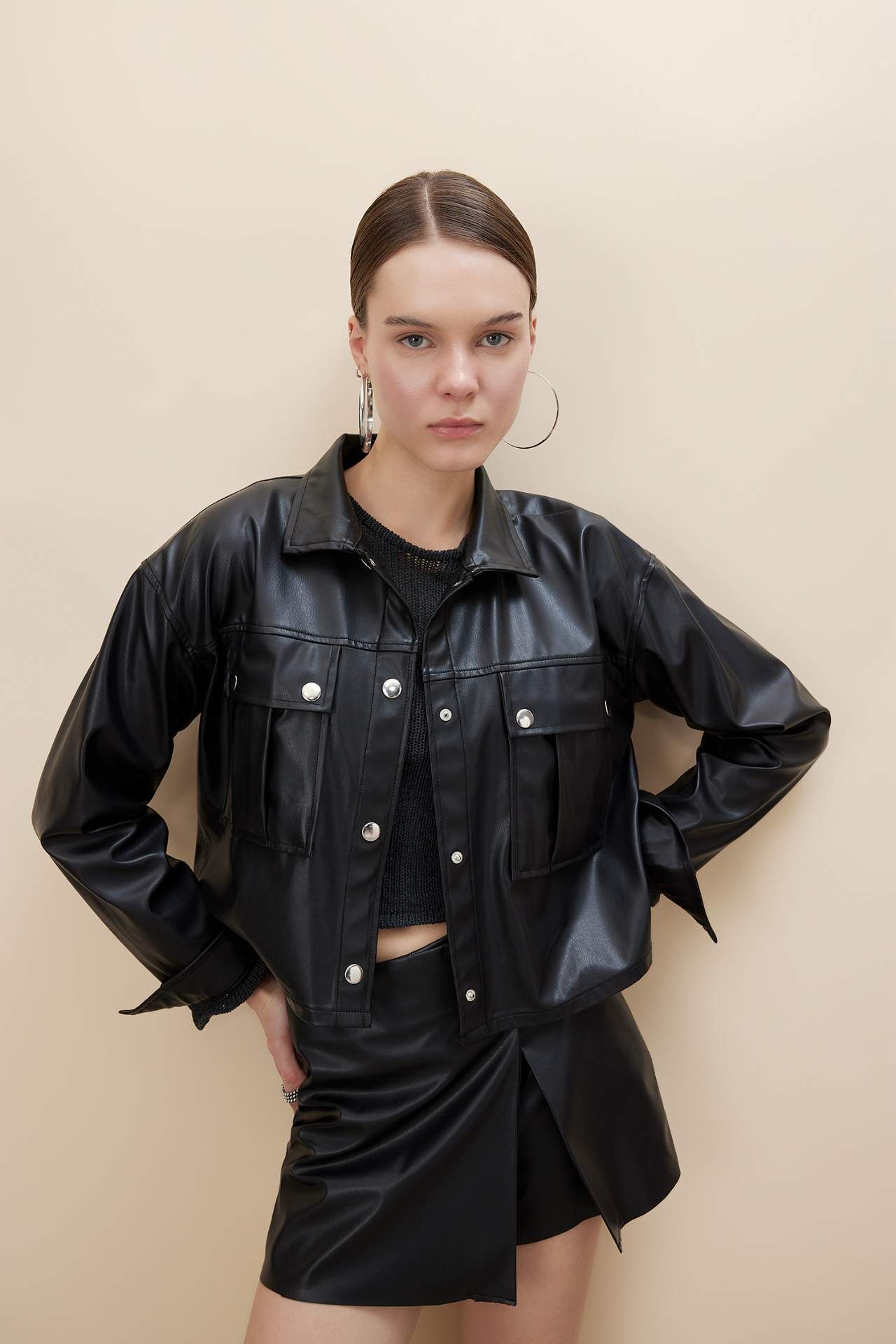 Bu oversize fit gömlek yaka suni deri uzun kollu gömlek, şıklığı ve rahatlığı bir araya getiriyor. Yüksek kaliteli suni deri malzemeden üretilmiştir ve oversize kesimiyle modern bir görünüm sunar. Uzun kollu tasarımıyla her mevsimde kullanabilirsiniz. Hem günlük hayatta hem de özel davetlerde şık bir seçenek olan bu gömlek, gardırobunuzun vazgeçilmez parçalarından biri olacak. Poliester 100%,Polivinil Klorür 100%,Poliester 100%,Polivinil Klorür 100%