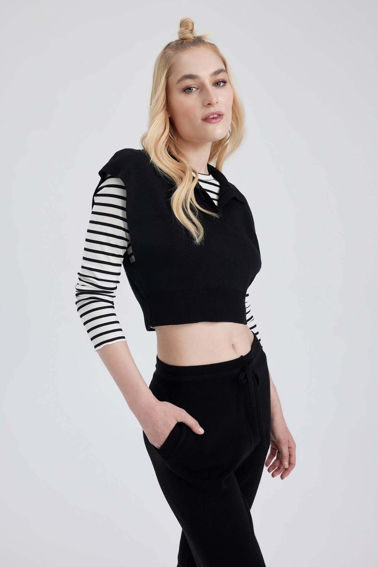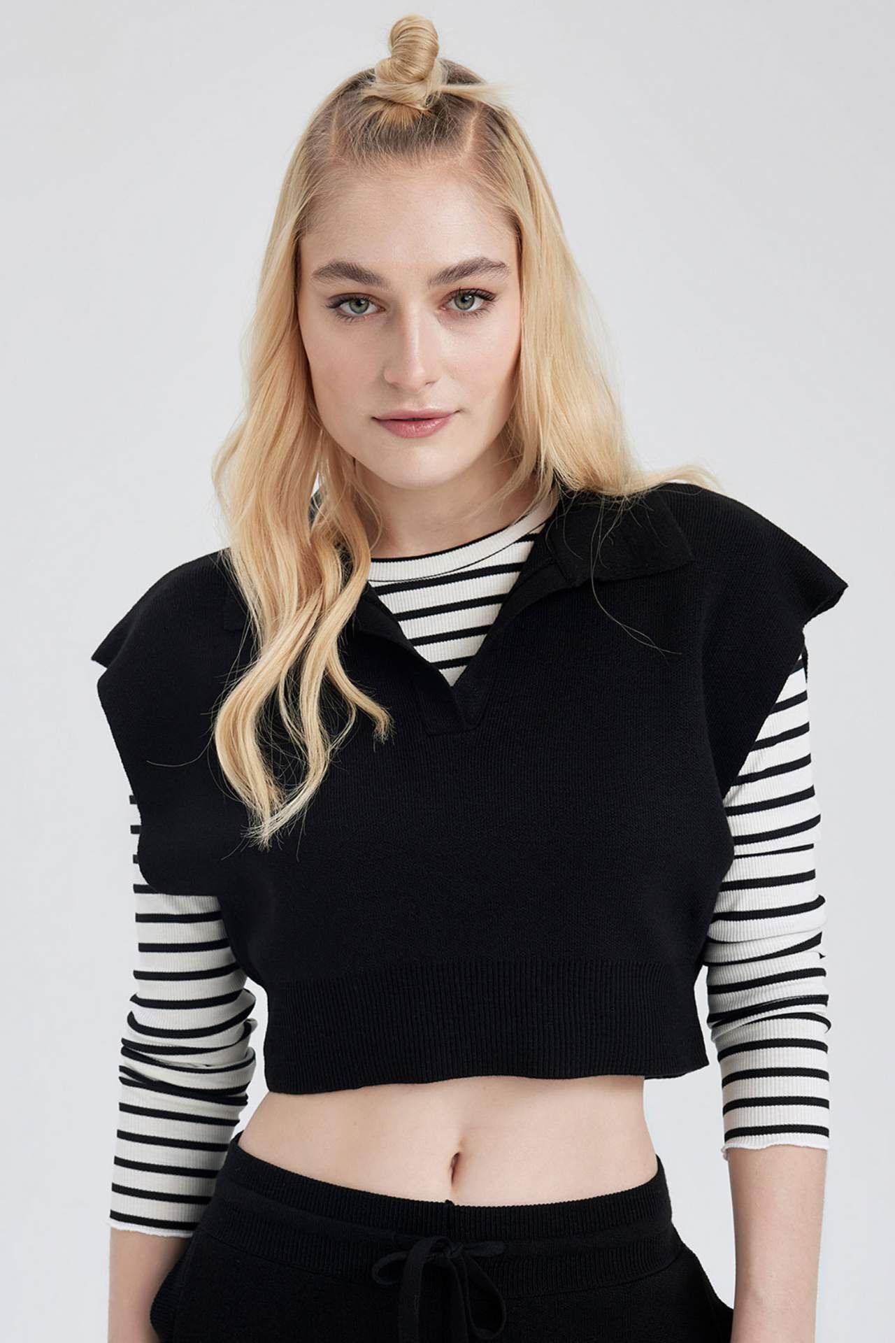 DeFactoFit Polo Yaka Relax Fit Crop Triko Süveter