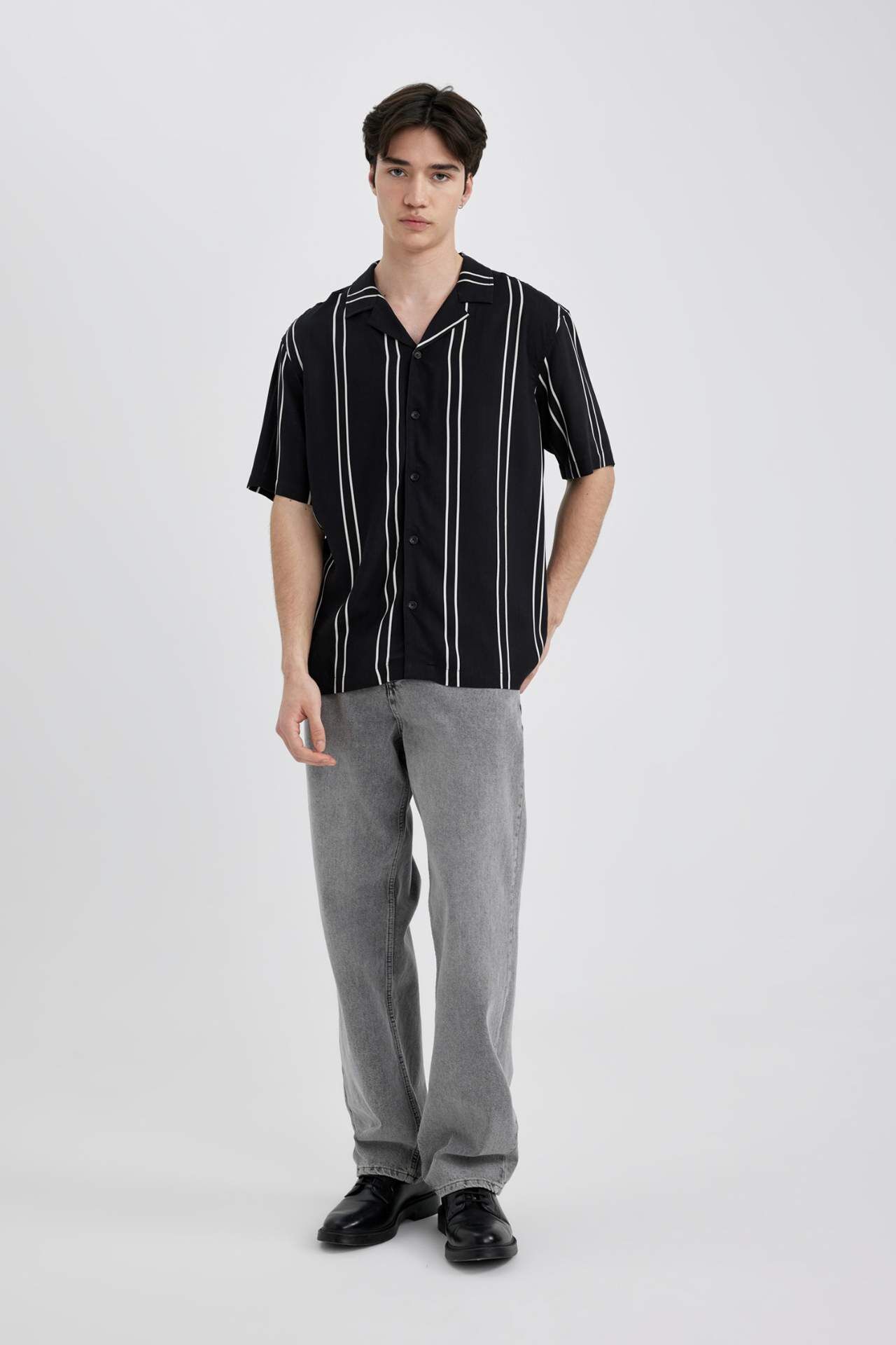 Şıklığı ve rahatlığı bir arada sunan Regular Fit Apaş Yaka Çizgili Kısa Kollu Gömlek, gardırobunuzun vazgeçilmezi olmaya aday. Kaliteli kumaşı ve şık tasarımı ile her tarza uyum sağlar. Hem iş hem de günlük kullanıma uygun olan bu gömlek, tarzınızı yansıtmanızı sağlar. Viskoz 100%,Viskoz 100% Manken Bedeni: Göğüs: 91 Boy: 1,85 Basen: 92 Bel: 71