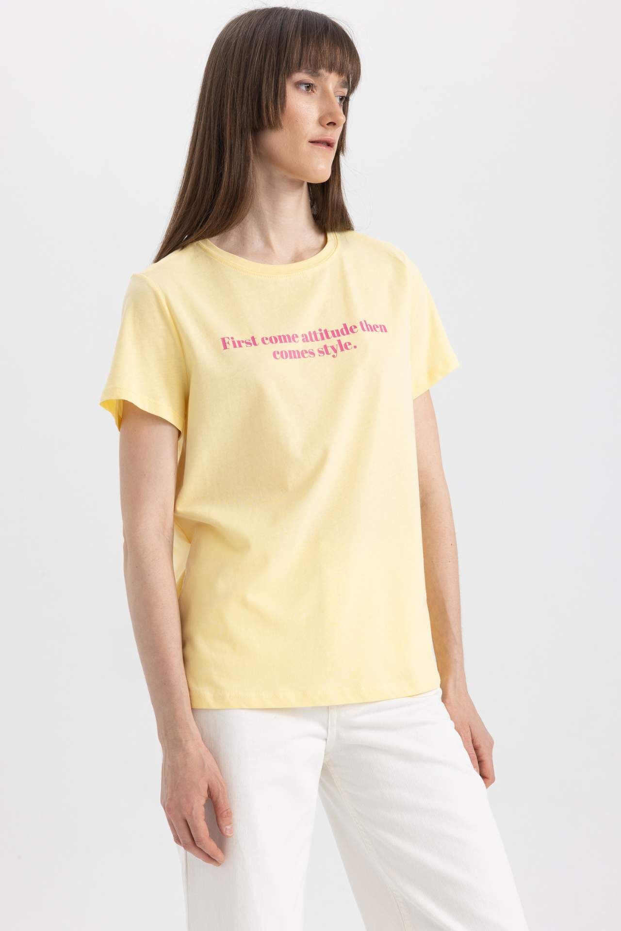 Trend slogan baskılı, regular fit rahat tasarımı ve kaliteli pamuklu kumaşı ile her mevsim gardırobunuzda bulunması gereken, blazer gömleklerinizin içinde şehirli ve havalı, basic kombinlerinizde sınırsız ve rahat hissedebileceğiniz her gün bir çok kombininize dahil edebileceğiniz kullanışlı rengiyle DeFacto Kadın Regular Fit Bisiklet Yaka Baskılı Kısa Kollu Tişört. Pamuk 100%,Pamuk 100%