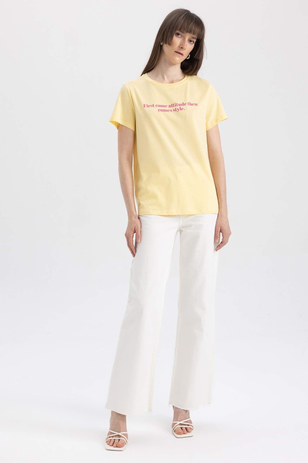 DeFactoFit Regular Fit Bisiklet Yaka Baskılı Kısa Kollu Tişört Sarı