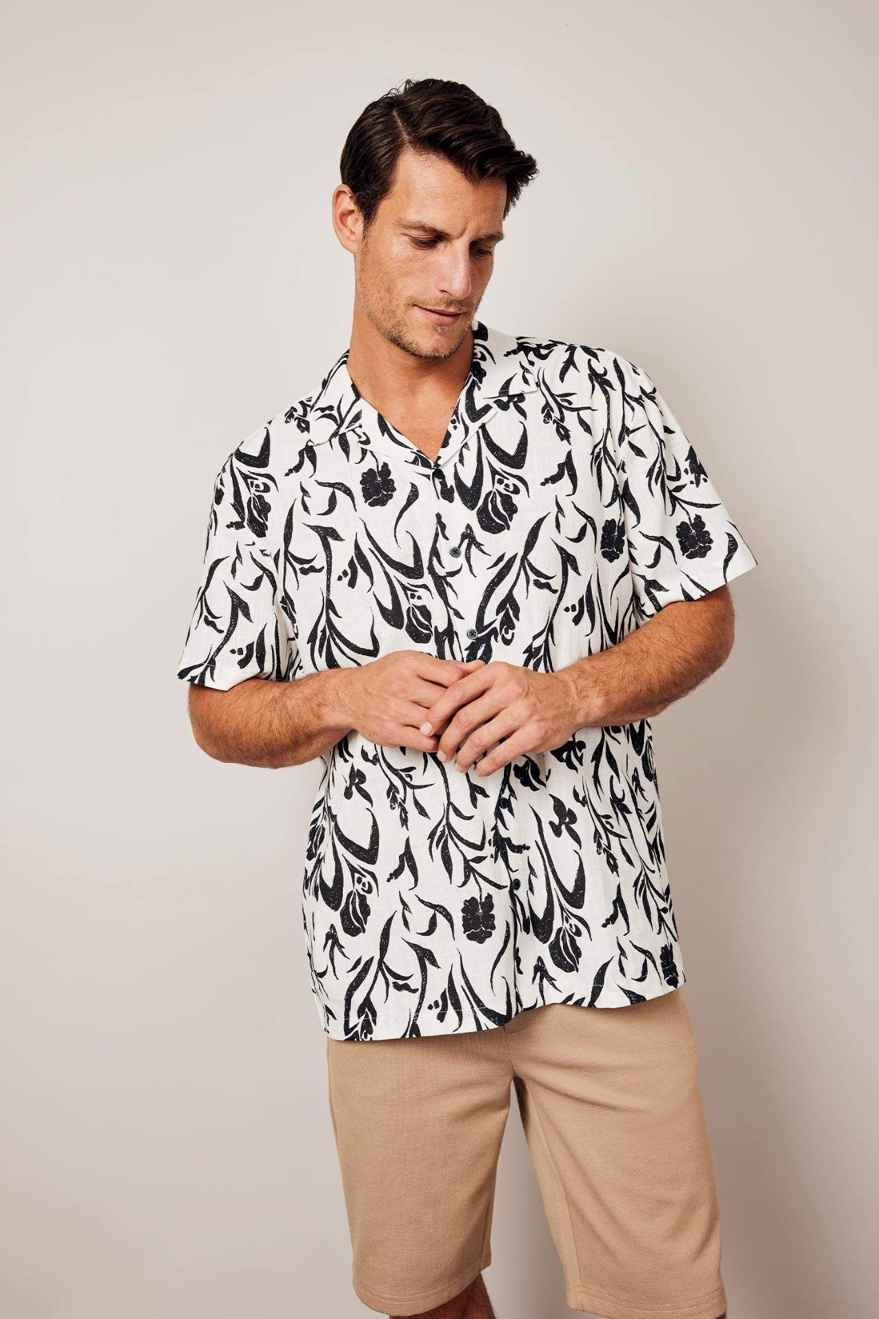DeFactoFit Regular Fit Polo Yaka Baskılı Keten Karışımlı Kısa Kollu Gömlek