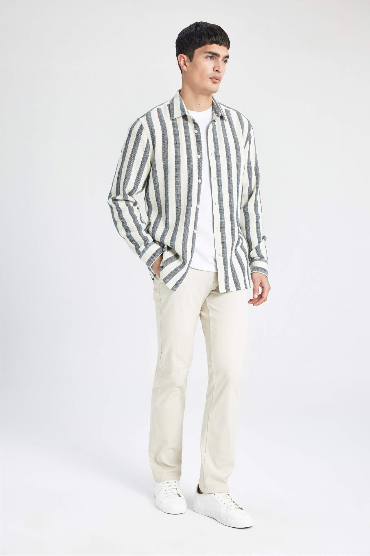 DeFactoFit Regular Fit Polo Yaka Pamuklu Çizgili Uzun Kollu Gömlek