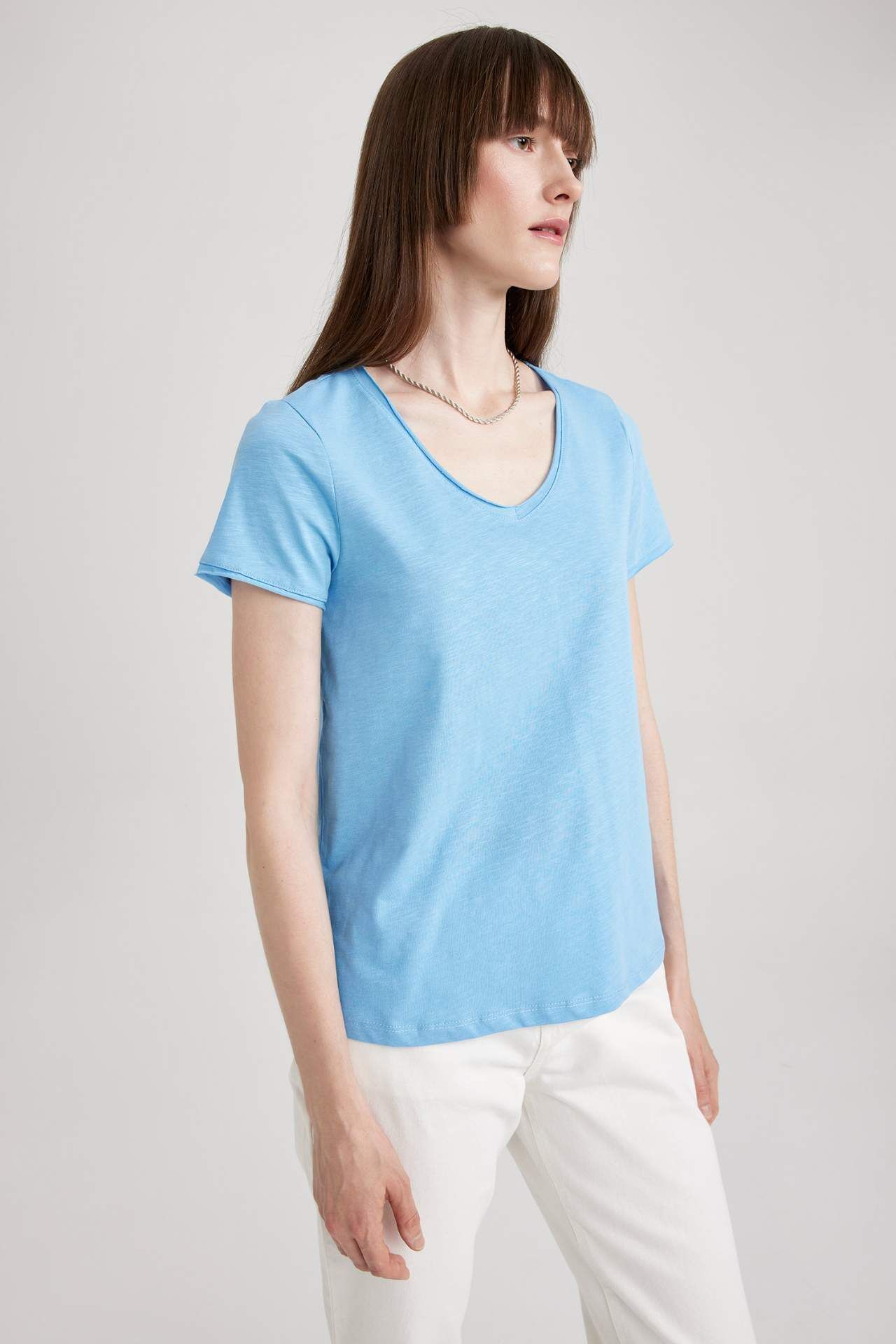 Tasarımı ve rahat kalıbı ile her kadının mutlaka dolabında olması gereken, her renk pantolon ve etekle kolayca kombinlenebilen V sosis yaka, kısa kollu, regular fit basic modeli ile blazer ceket, hırkalarınızla kombinleyeceğiniz DeFacto Kadın Regular Fit V Yaka Kısa Kollu Tişört. Pamuk 100%,Pamuk 100%