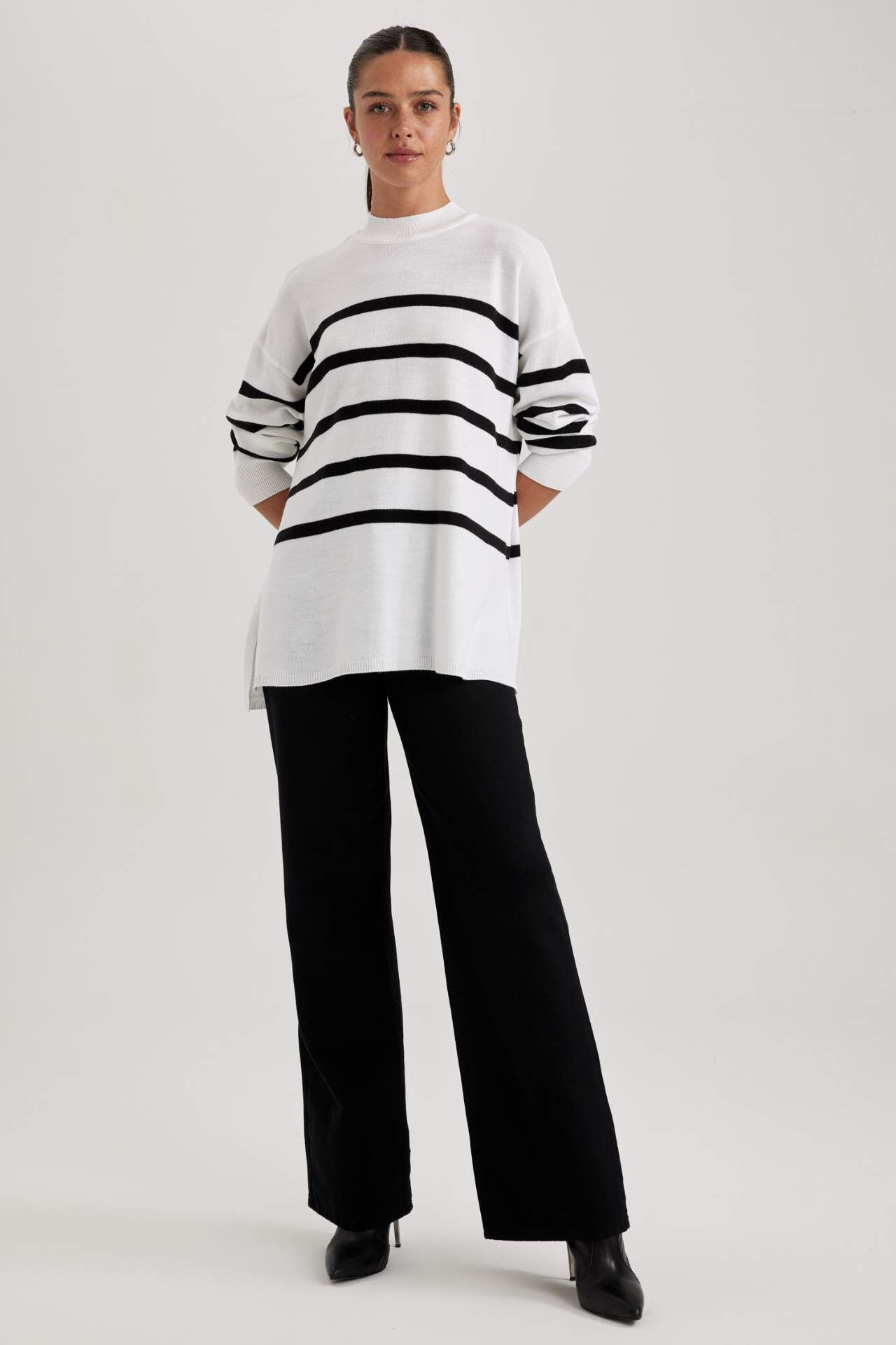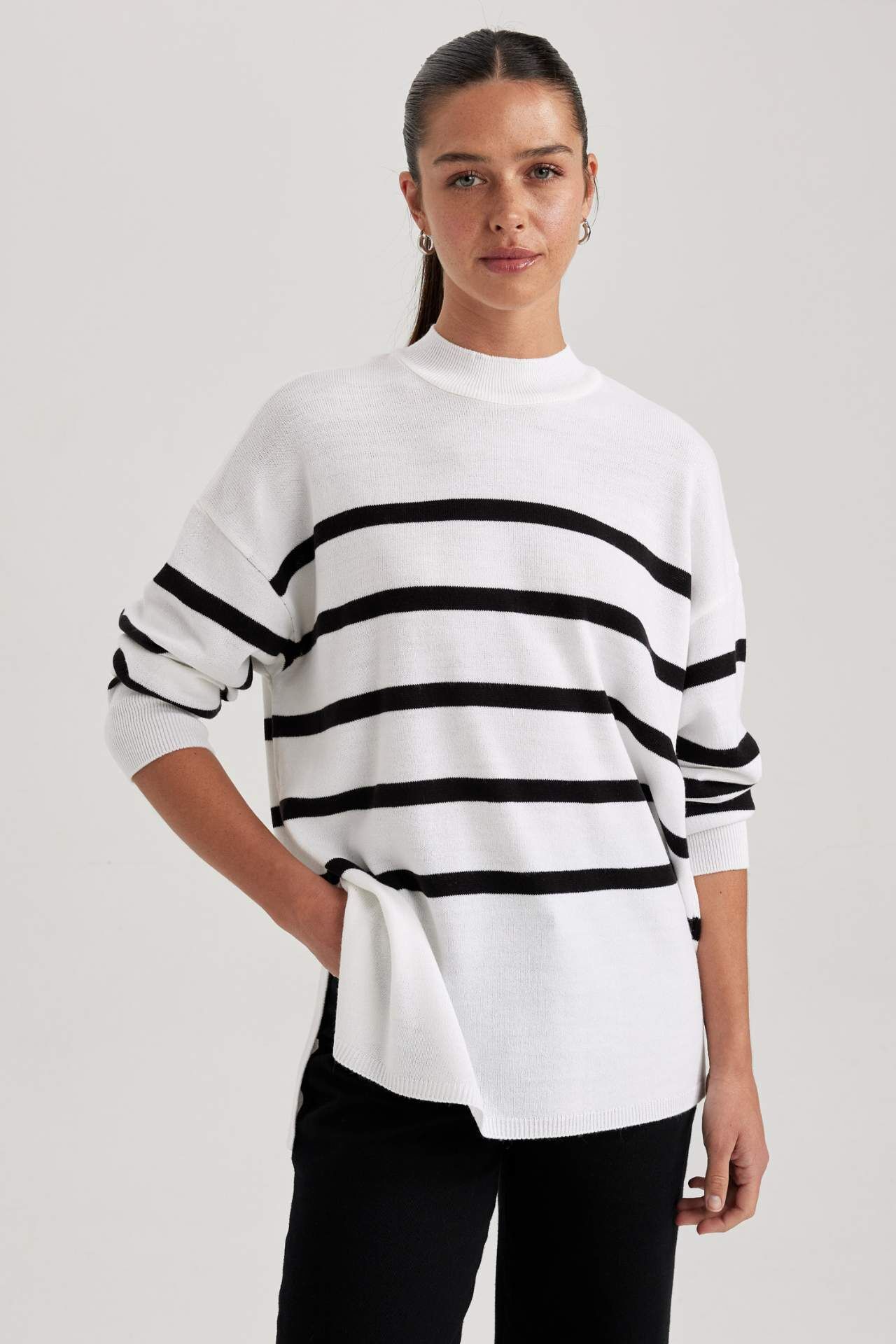 Şık tarzı ile günlük giyiminizde sıkça kullanacağınız, boyfriend jean, palazzo pantolon, suni deri ceket ve taytlarınızla rahatlıkla kombinleyebileceğiniz, çizgili detaylı esnek kumaşı ile mükemmel kalıbıyla tercih edeceğiniz Relax Fit Bisiklet Yaka Tunik. Akrilik 100% Manken Bedeni: Göğüs: 81 Boy: 1,75 Basen: 88 Bel: 60