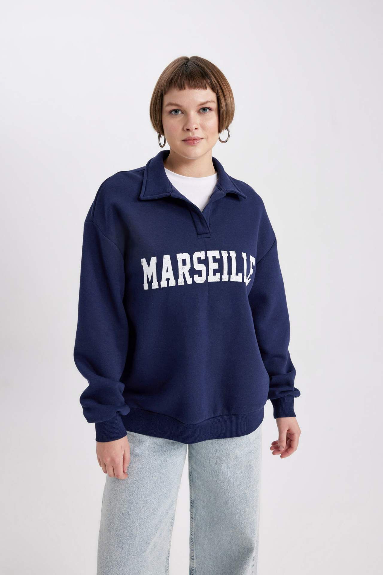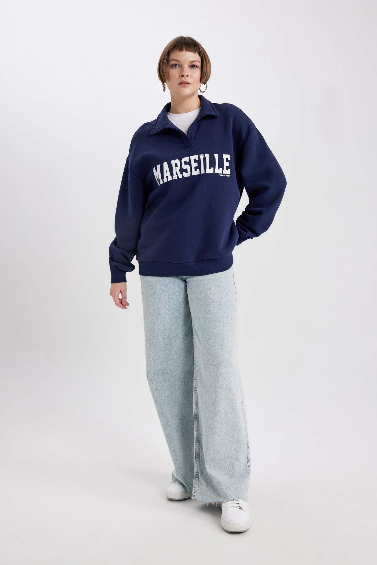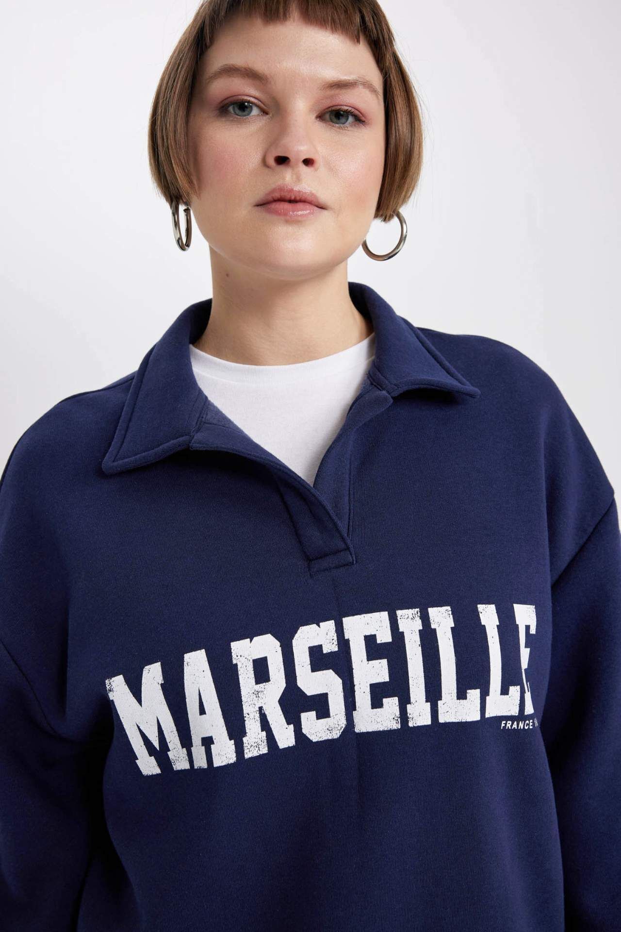 DeFactoFit Relax Fit Polo Yaka Baskılı Kalın Sweatshirt
