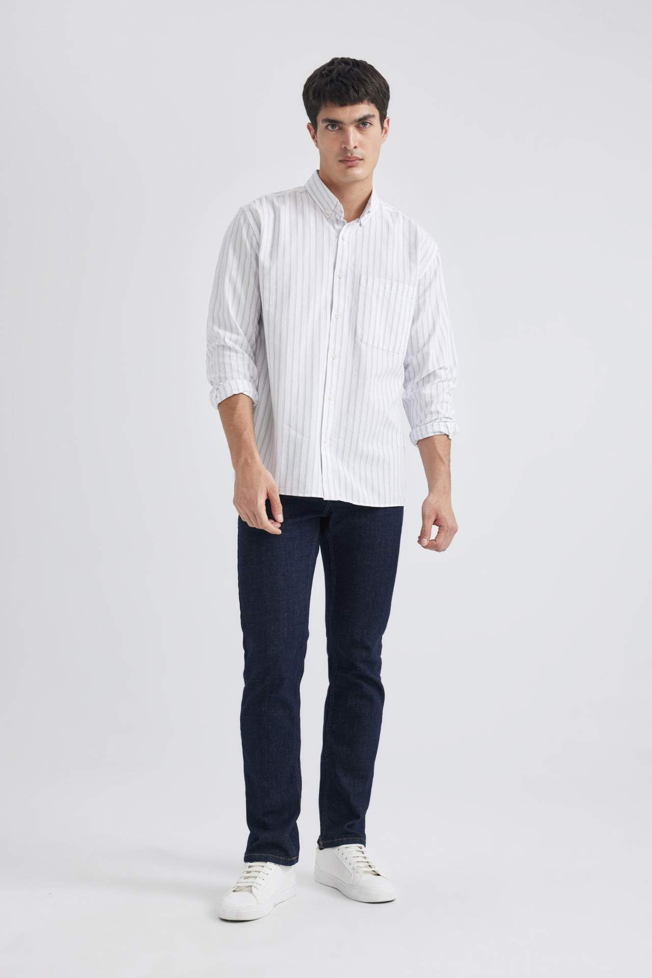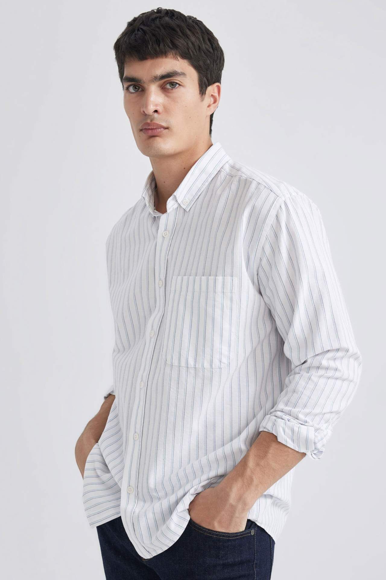 DeFactoFit Relax Fit Polo Yaka Çizgili Oxford Uzun Kollu Gömlek