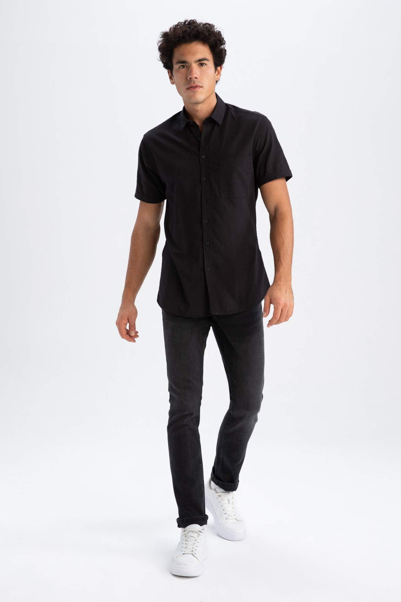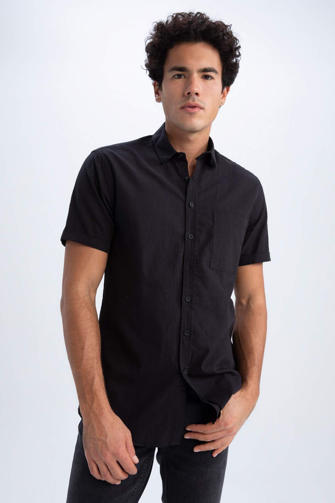 DeFactoFit Slim Fit Polo Yaka Kısa Kollu Gömlek Siyah