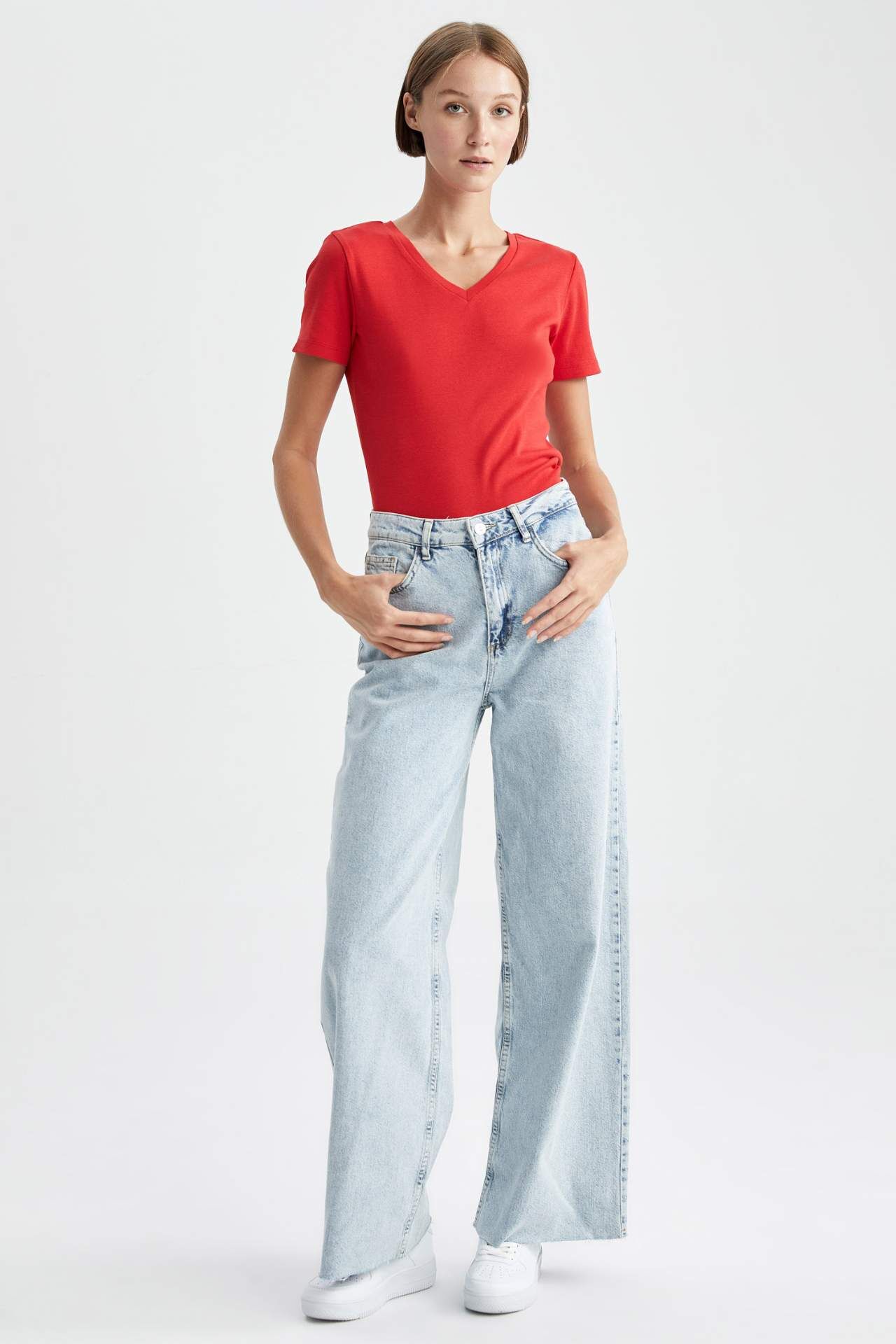 Trend tasarımı ve kaliteli pamuk karışımlı kumaşı ile her mevsim gardırobunuzda bulunması gereken kullanışlı v yaka modeliyle, jogger eşofman altı, jogger pantolon, jean pantolon, jean şort, mom jean, boyfriend jean, yüksek belli pantolon, blazer ceket, şort etek ve eteklerinizle kombinleyebileceğiniz DeFacto Kadın Slim Fit V Yaka Basic Kısa Kollu Tişört. Pamuk 100%,Pamuk 100% Manken Bedeni: Göğüs: 79 Boy: 1,8 Basen: 88 Bel: 58