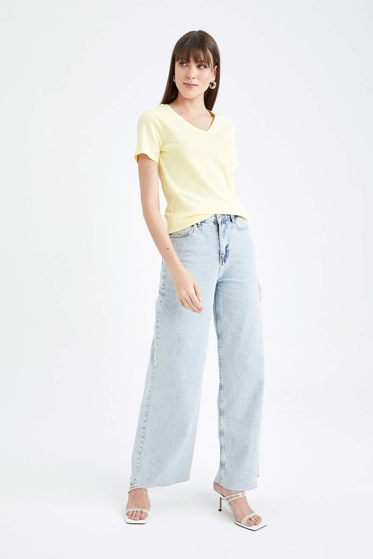 Slim Fit V Yaka Kısa Kollu Tişört Sarı